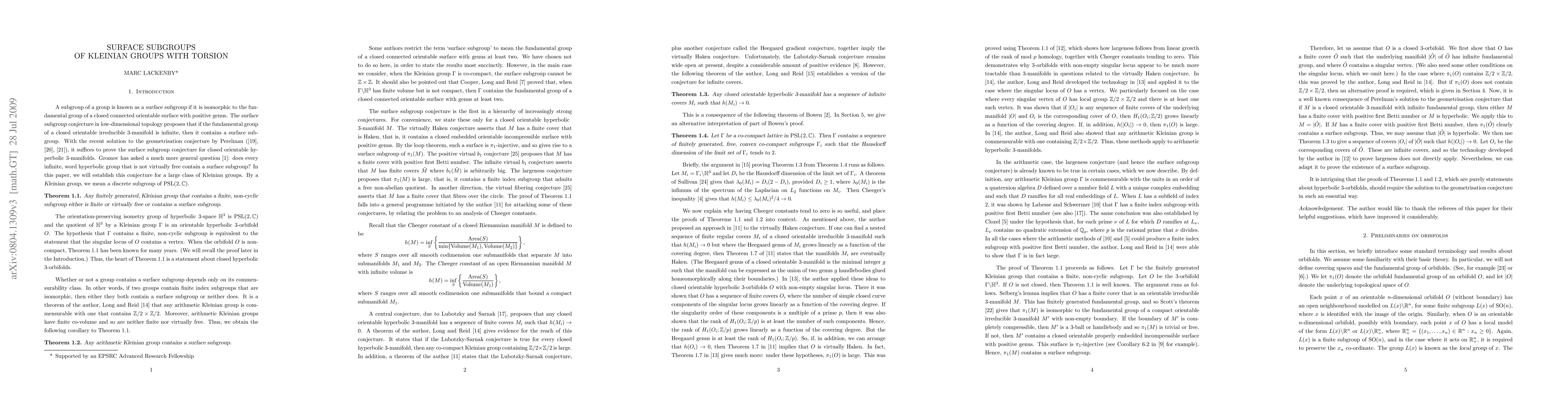 Researchers prove that finitely generated Kleinian groups with finite non-cyclic subgroups are either finite, virtually free, or contain a surface subgroup, implying every arithmetic group contains a surface subgroup.
