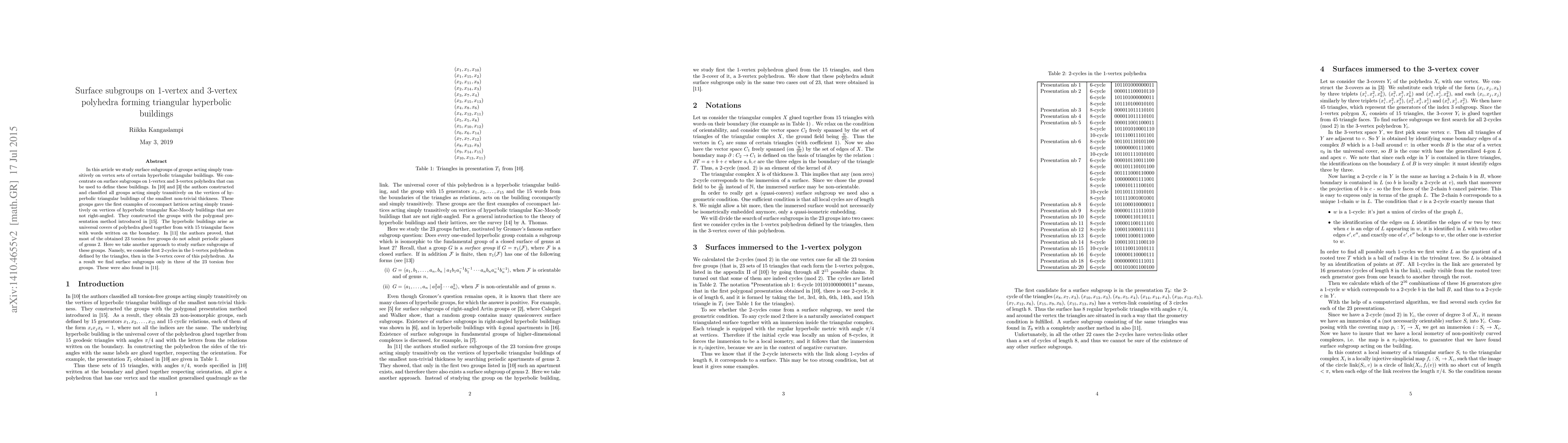This paper investigates surface subgroups within groups acting simply transitively on vertices of hyperbolic triangular buildings, focusing on 1-vertex and 3-vertex polyhedra. The authors identify surface subgroups in three out of 23 torsion-free groups using a novel approach based on 2-cycles in these polyhedra.