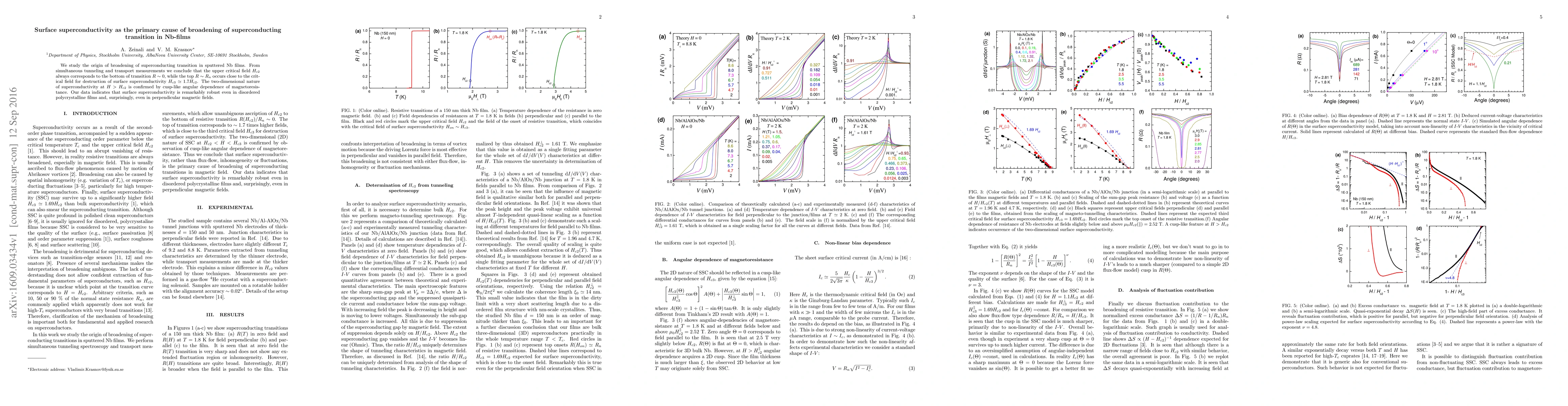 We study the origin of broadening of superconducting transition in sputtered Nb films. From simultaneous tunneling and transport measurements we conclude that the upper critical field Hc2 always corresponds to the bottom of transition R~0, while the top R~Rn occurs close to the critical field for destruction of surface superconductivity Hc3 ~ 1.7 Hc2. The two-dimensional nature of superconductivity at H>Hc2 is confirmed by cusp-like angular dependence of magnetoresistance. Our data indicates that surface superconductivity is remarkably robust even in disordered polycrystalline films and, surprisingly, even in perpendicular magnetic fields.