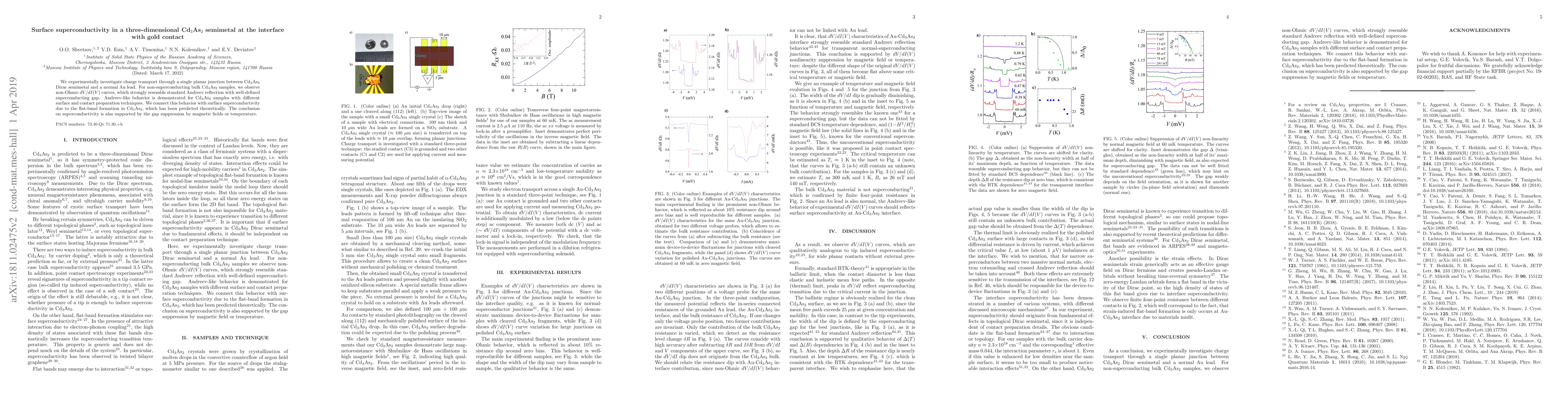This study experimentally demonstrates surface superconductivity in three-dimensional Cd$_3$As$_2$ semimetal via charge transport through planar junctions with Au leads, showing Andreev-like behavior linked to flat-band formation and suppressed by magnetic fields and temperature.