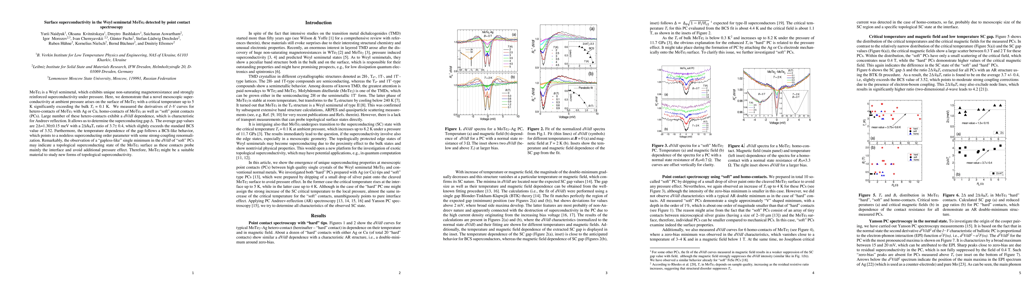 MoTe2 is a Weyl semimetal, which exhibits unique non-saturating magnetoresistance and strongly reinforced superconductivity under pressure. Here, we demonstrate that a novel mesoscopic superconductivity at ambient pressure arises on the surface of MoTe2 with a critical temperature up to 5 K significantly exceeding the bulk Tc=0.1K. We measured the derivatives of I-V curves for metallic hetero-contacts of MoTe2 with Ag or Cu, homo-contacts of MoTe2 as well as "soft" point contacts (PCs). Large number of these hetero-contacts exhibit a dV/dI dependence, which is characteristic for Andreev reflection. It allows to determine the superconducting gap \Delta. The average gap values are 2\Delta=1.30+/-0.15 meV with a 2\Delta/kBTc ratio of 3.7+/-0.4, which slightly exceeds the standard BCS value of 3.52. Furthermore, the temperature dependence of the gap follows a BCS-like behavior, which points to a nodeless superconducting order parameter with some strong-coupling renormalization. Remarkably, the observation of a "gapless-like" single minimum in the dV/dI of "soft" PCs may indicate a topological superconducting state of the MoTe2 surface as these contacts probe mainly the interface and avoid additional pressure effect. Therefore, MoTe2 might be a suitable material to study new forms of topological superconductivity.