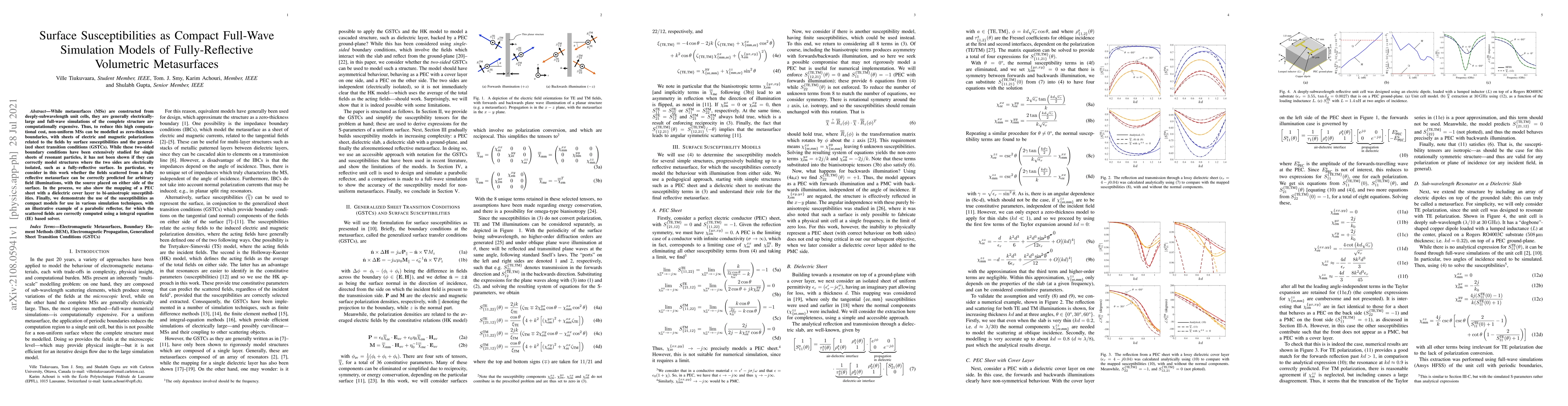 This paper explores the use of surface susceptibilities to create compact full-wave simulation models for fully-reflective volumetric metasurfaces, demonstrating their ability to accurately predict scattered fields for arbitrary illuminations. The study also maps a PEC sheet with a dielectric cover to bi-anisotropic susceptibilities and validates the models using an integral equation solver for a parabolic reflector.