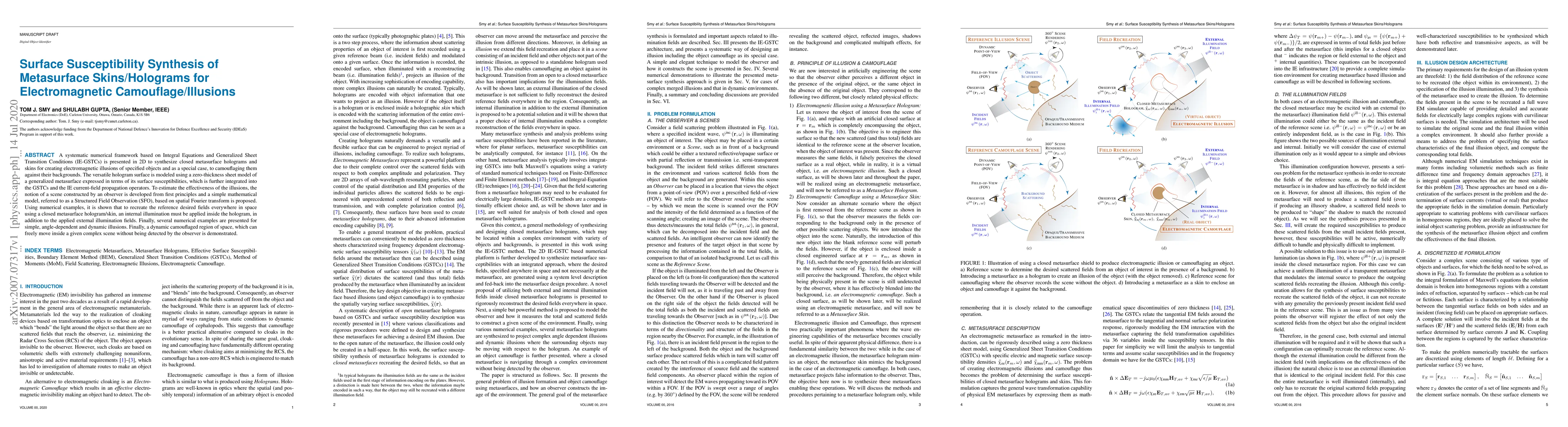 This paper presents a numerical framework for synthesizing metasurface skins and holograms using Integral Equations and Generalized Sheet Transition Conditions to create electromagnetic illusions and camouflage. The study introduces a zero-thickness sheet model and a Structured Field Observation model to evaluate the effectiveness of the illusions, demonstrating the necessity of internal illumination for desired field recreation.