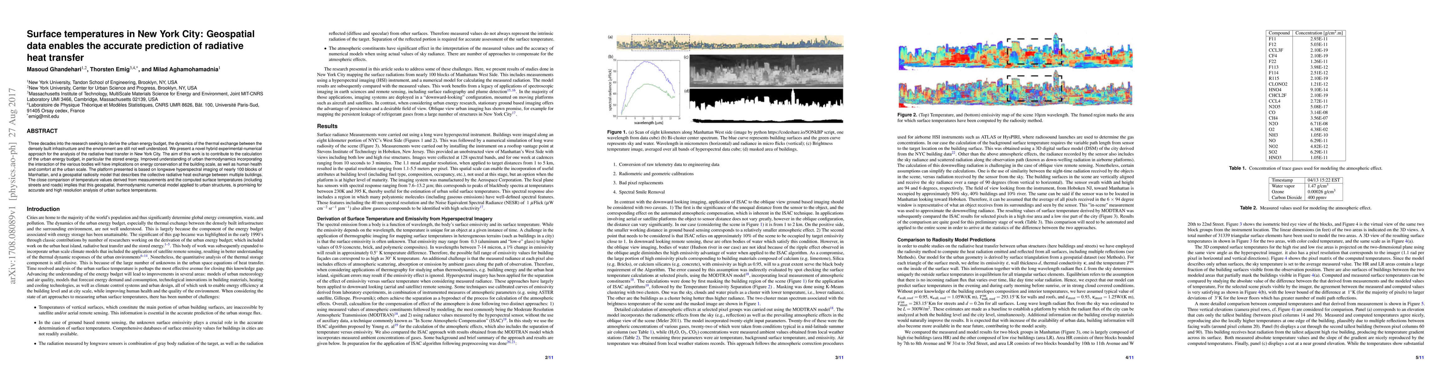 Three decades into the research seeking to derive the urban energy budget, the dynamics of the thermal exchange between the densely built infrastructure and the environment are still not well understood. We present a novel hybrid experimental-numerical approach for the analysis of the radiative heat transfer in New York City. The aim of this work is to contribute to the calculation of the urban energy budget, in particular the stored energy. Improved understanding of urban thermodynamics incorporating the interaction of the various bodies will have implications on energy conservation at the building scale, as well as human health and comfort at the urban scale. The platform presented is based on longwave hyperspectral imaging of nearly 100 blocks of Manhattan, and a geospatial radiosity model that describes the collective radiative heat exchange between multiple buildings. The close comparison of temperature values derived from measurements and the computed surface temperatures (including streets and roads) implies that this geospatial, thermodynamic numerical model applied to urban structures, is promising for accurate and high resolution analysis of urban surface temperatures.