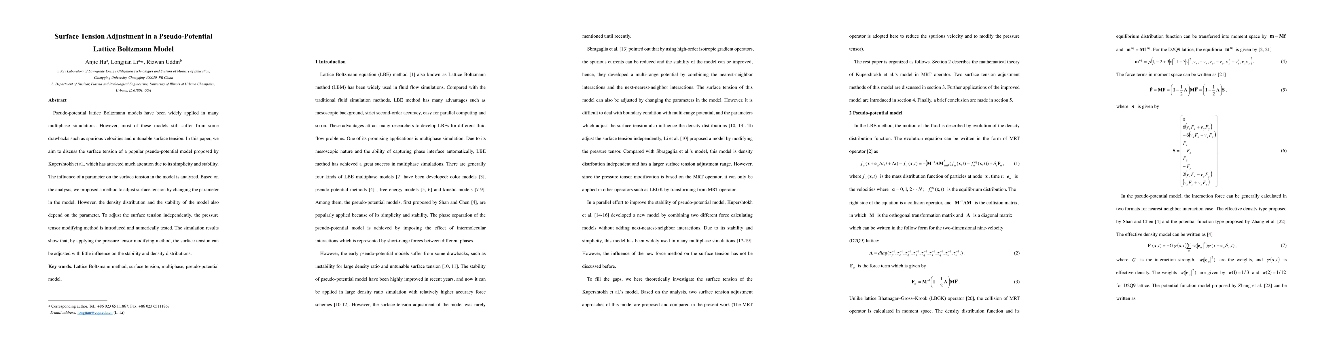 This paper proposes a method to adjust surface tension in a pseudo-potential lattice Boltzmann model by modifying a key parameter, while introducing a pressure tensor technique to maintain stability and density distribution. Simulation results show successful adjustment of surface tension with minimal impact on model stability.