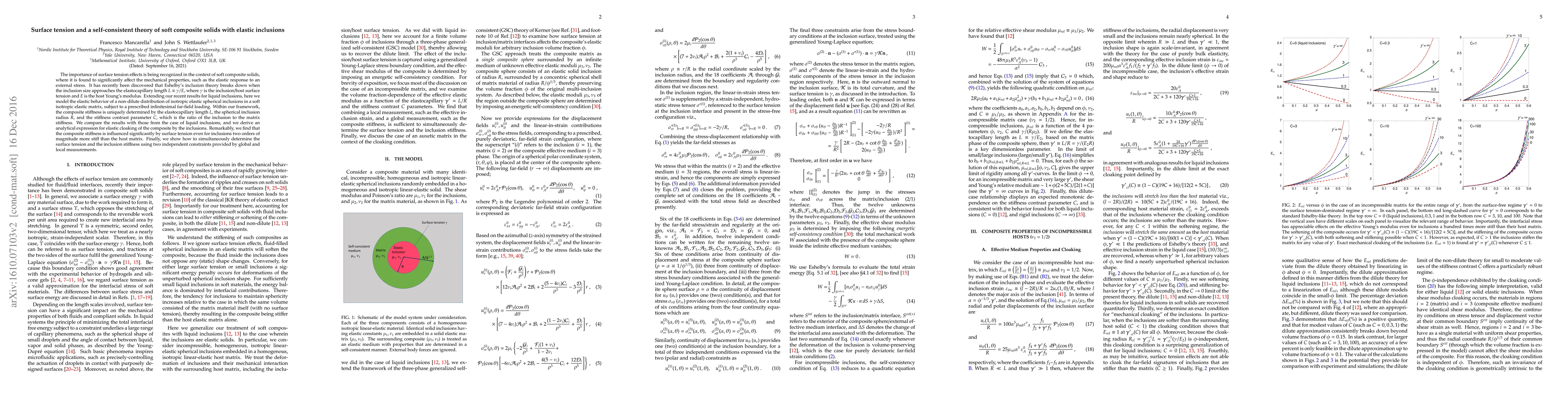 This paper presents a self-consistent theory for soft composite solids with elastic inclusions, showing that surface tension significantly influences their elastic response. The model extends previous results for liquid inclusions and reveals that composite stiffness is determined by the elastocapillary length, inclusion size, and stiffness contrast, with surface tension affecting even very stiff inclusions.