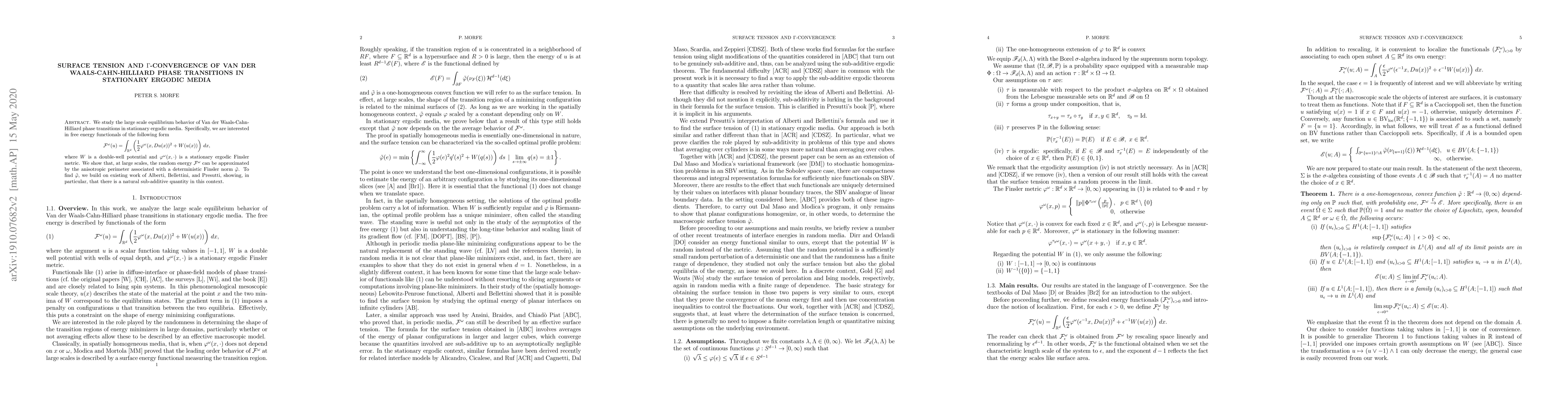 We study the large scale equilibrium behavior of Van der Waals-Cahn-Hilliard phase transitions in stationary ergodic media. Specifically, we are interested in free energy functionals of the following form \begin{equation*} \mathcal{F}^{\omega}(u) = \int_{\mathbb{R}^{d}} \left(\frac{1}{2} \varphi^{\omega}(x,Du(x))^{2} + W(u(x)) \right) \, dx, \end{equation*} where $W$ is a double-well potential and $\varphi^{\omega}(x,\cdot)$ is a stationary ergodic Finsler metric. We show that, at large scales, the random energy $\mathcal{F}^{\omega}$ can be approximated by the anisotropic perimeter associated with a deterministic Finsler norm $\tilde{\varphi}$. To find $\tilde{\varphi}$, we build on existing work of Alberti, Bellettini, and Presutti, showing, in particular, that there is a natural sub-additive quantity in this context.