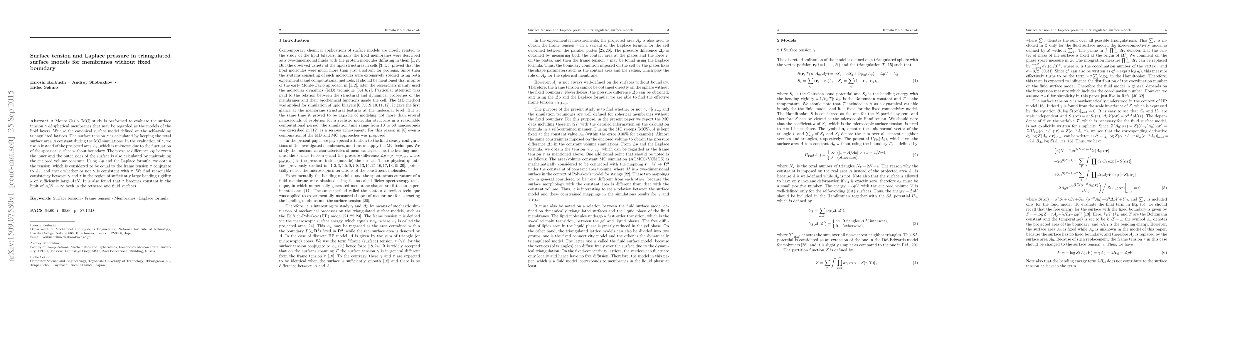 A Monte Carlo (MC) study is performed to evaluate the surface tension $\gamma $ of spherical membranes that may be regarded as the models of the lipid layers. We use the canonical surface model defined on the self-avoiding triangulated lattices. The surface tension $\gamma $ is calculated by keeping the total surface area $A$ constant during the MC simulations. In the evaluation of $\gamma $, we use $A$ instead of the projected area $A_p$, which is unknown due to the fluctuation of the spherical surface without boundary. The pressure difference ${\it\Delta}p $ between the inner and the outer sides of the surface is also calculated by maintaining the enclosed volume constant. Using ${\it\Delta}p $ and the Laplace formula, we obtain the tension, which is considered to be equal to the frame tension $\tau$ conjugate to $A_p$, and check whether or not $\gamma $ is consistent with $\tau$. We find reasonable consistency between $\gamma$ and $\tau$ in the region of sufficiently large bending rigidity $\kappa$ or sufficiently large $A/N$. It is also found that $\tau$ becomes constant in the limit of $A/N\to \infty$ both in the tethered and fluid surfaces.