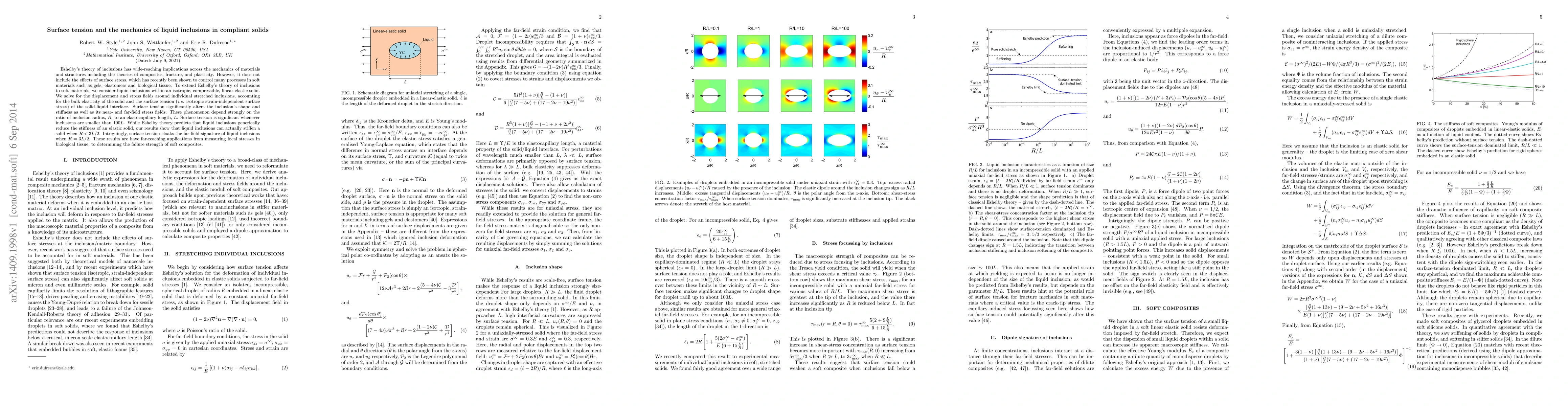Eshelby's theory of inclusions has wide-reaching implications across the mechanics of materials and structures including the theories of composites, fracture, and plasticity. However, it does not include the effects of surface stress, which has recently been shown to control many processes in soft materials such as gels, elastomers and biological tissue. To extend Eshelby's theory of inclusions to soft materials, we consider liquid inclusions within an isotropic, compressible, linear-elastic solid. We solve for the displacement and stress fields around individual stretched inclusions, accounting for the bulk elasticity of the solid and the surface tension (\textit{i.e.} isotropic strain-independent surface stress) of the solid-liquid interface. Surface tension significantly alters the inclusion's shape and stiffness as well as its near- and far-field stress fields. These phenomenon depend strongly on the ratio of inclusion radius, $R$, to an elastocapillary length, $L$. Surface tension is significant whenever inclusions are smaller than $100L$. While Eshelby theory predicts that liquid inclusions generically reduce the stiffness of an elastic solid, our results show that liquid inclusions can actually stiffen a solid when $R<3L/2$. Intriguingly, surface tension cloaks the far-field signature of liquid inclusions when $R=3L/2$. These results are have far-reaching applications from measuring local stresses in biological tissue, to determining the failure strength of soft composites.