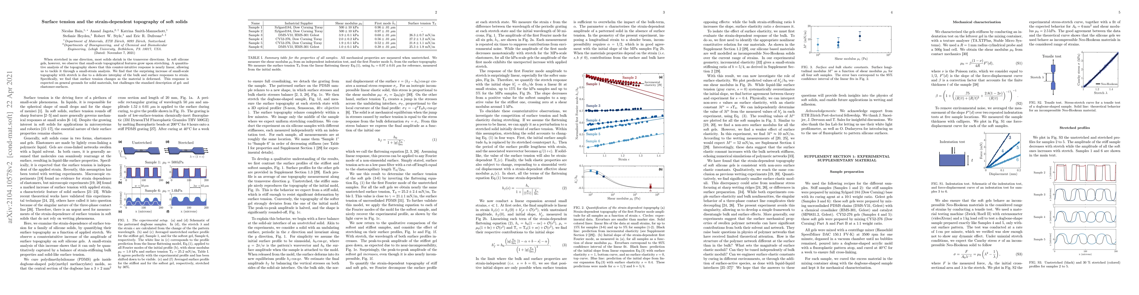 Title: Surface tension and the strain-dependent topography of soft solids Summary: This study reveals that soft silicone gels exhibit an unexpected increase in small-scale topographical features when stretched, attributed to a counterintuitive interplay between bulk and surface strain responses, specifically due to changes in surface tension during deformation.