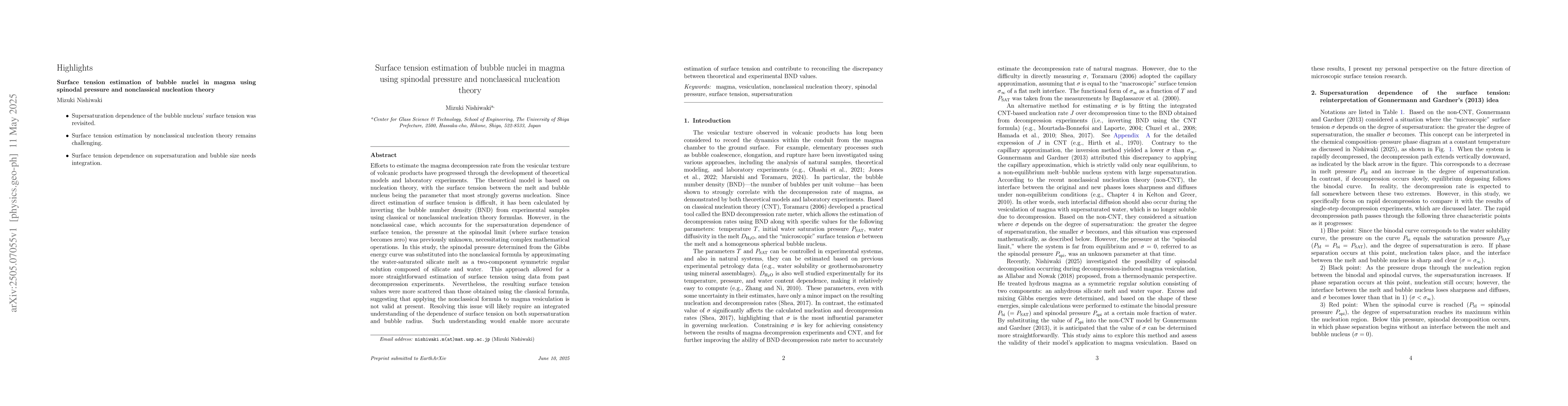 Efforts to estimate the magma decompression rate from the vesicular texture of volcanic products have progressed through the development of theoretical models and laboratory experiments. The theoretical model is based on nucleation theory, with the surface tension between the melt and bubble nucleus being the parameter that most strongly governs nucleation. Since direct estimation of surface tension is difficult, it has been calculated by inverting the bubble number density (BND) from experimental samples using classical or nonclassical nucleation theory formulas. However, in the nonclassical case, which accounts for the supersaturation dependence of surface tension, the pressure at the spinodal limit (where surface tension becomes zero) was previously unknown, necessitating complex mathematical operations. In this study, the spinodal pressure determined from the Gibbs energy curve was substituted into the nonclassical formula by approximating the water-saturated silicate melt as a two-component symmetric regular solution composed of silicate and water. This approach allowed for a more straightforward estimation of surface tension using data from past decompression experiments. Nevertheless, the resulting surface tension values were more scattered than those obtained using the classical formula, suggesting that applying the nonclassical formula to magma vesiculation is not valid at present. Resolving this issue will likely require an integrated understanding of the dependence of surface tension on both supersaturation and bubble radius. Such understanding would enable more accurate estimation of surface tension and contribute to reconciling the discrepancy between theoretical and experimental BND values.
