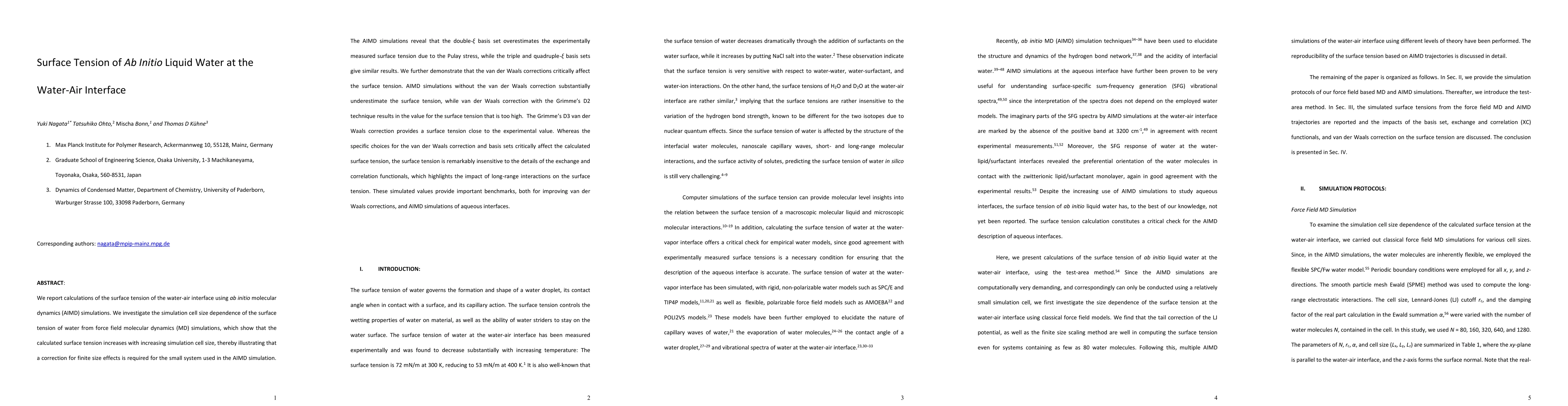 This paper reports ab initio molecular dynamics simulations to calculate the surface tension of liquid water at the water-air interface, highlighting the dependence on simulation cell size and the impact of van der Waals corrections and basis sets. The study finds that Grimme's D3 van der Waals correction, along with appropriate basis sets, yields a surface tension value close to experimental measurements.