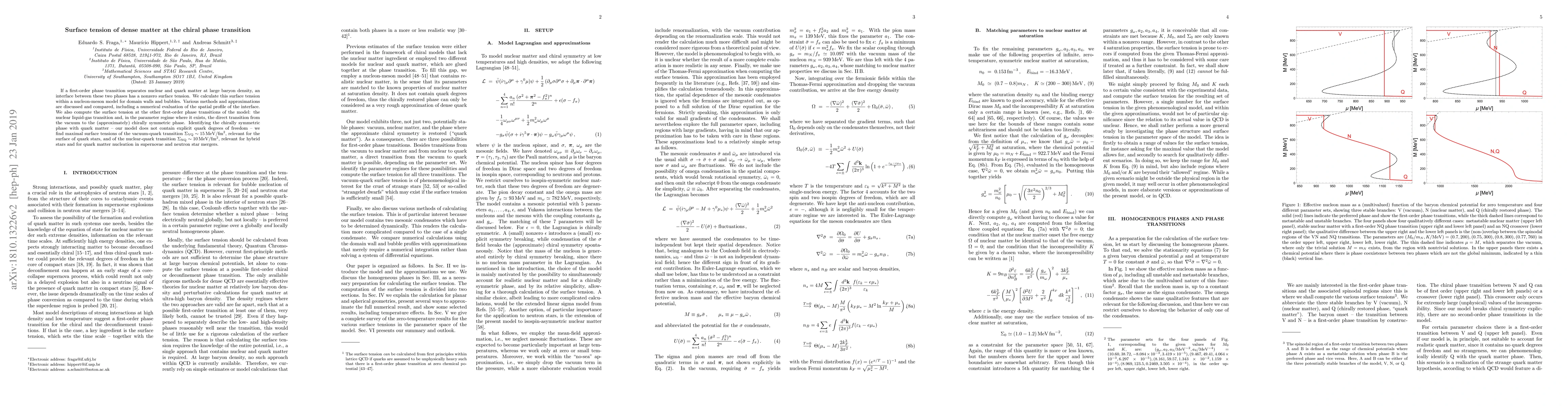This paper calculates the surface tension at first-order phase transitions between nuclear and quark matter, finding maximal values of $\Sigma_{\rm VQ}\sim 15 \, {\rm MeV}/{\rm fm}^2$ for vacuum-quark interfaces and $\Sigma_{\rm NQ}\sim 10 \, {\rm MeV}/{\rm fm}^2$ for nuclear-quark interfaces, using a nucleon-meson model.