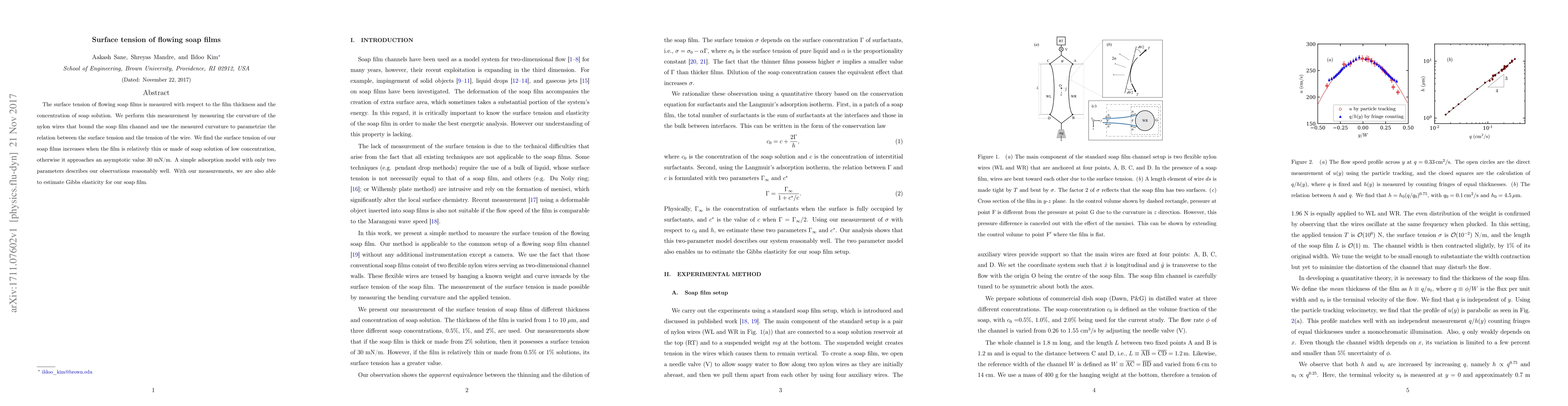 This study measures the surface tension of flowing soap films in relation to film thickness and soap concentration, finding that tension increases with thinner films or lower soap concentration, approaching an asymptotic value of 30 mN/m. A simple adsorption model effectively describes these observations.