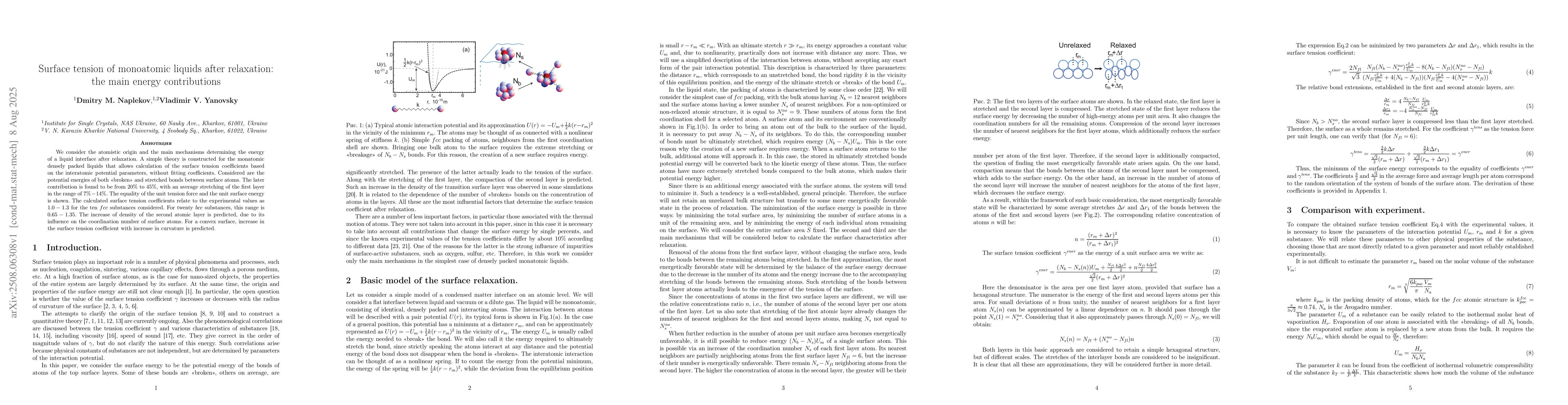 The development of a simple theory to calculate surface tension coefficients of monoatomic liquids post-relaxation, explicitly accounting for the energy contributions from stretched bonds and concentration differences between surface and bulk layers.