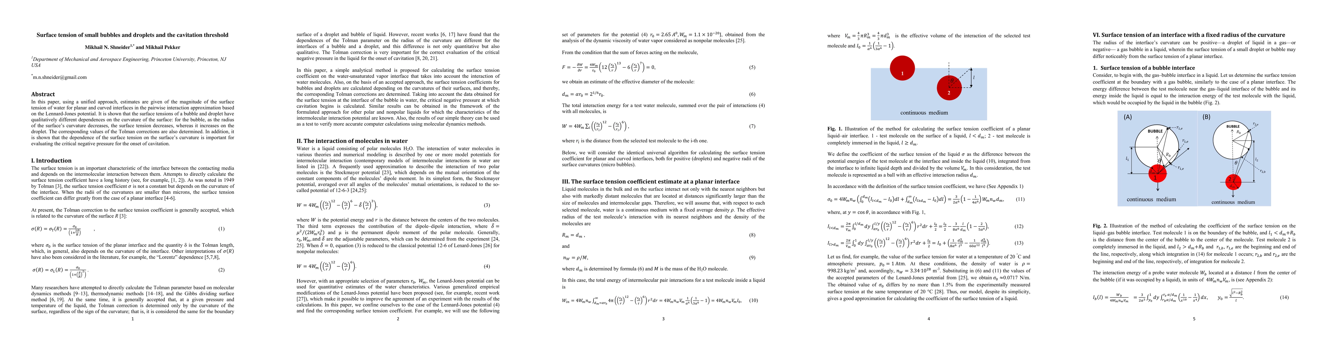 Research estimates surface tension of water for planar and curved interfaces, showing bubbles' surface tension decreases with curvature while droplets increase with curvature, affecting cavitation onset.