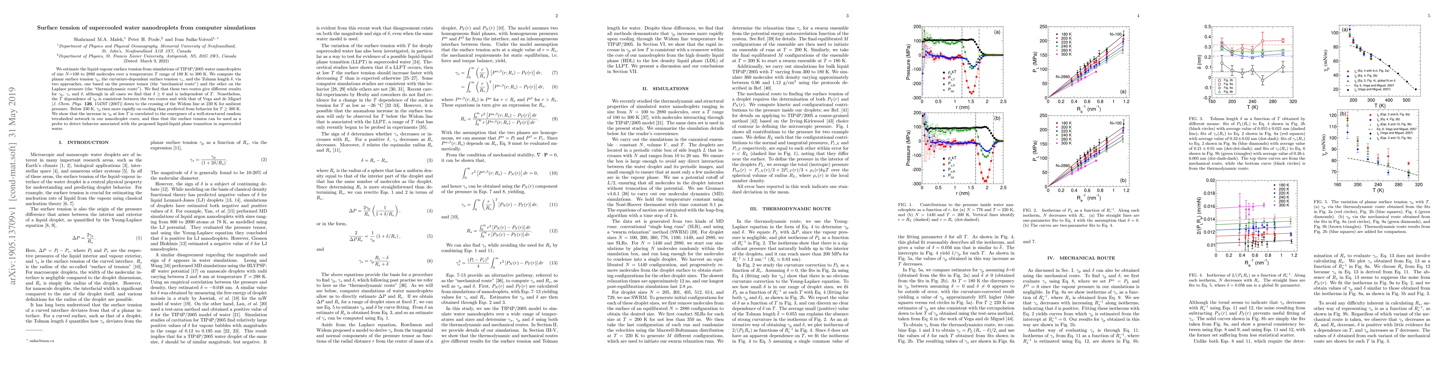 We estimate the liquid-vapour surface tension from simulations of TIP4P/2005 water nanodroplets of size $N$=100 to 2880 molecules over a temperature $T$ range of 180 K to 300 K. We compute the planar surface tension $\gamma_p$, the curvature-dependent surface tension $\gamma_s$, and the Tolman length $\delta$, via two approaches, one based on the pressure tensor (the "mechanical route") and the other on the Laplace pressure (the "thermodynamic route"). We find that these two routes give different results for $\gamma_p$, $\gamma_s$ and $\delta$, although in all cases we find that $\delta\ge 0$ and is independent of $T$. Nonetheless, the $T$ dependence of $\gamma_p$ is consistent between the two routes and with that of Vega and de Miguel [J. Chem. Phys. 126, 154707 (2007)] down to the crossing of the Widom line at 230 K for ambient pressure. Below 230 K, $\gamma_p$ rises more rapidly on cooling than predicted from behavior for $T\ge 300$ K. We show that the increase in $\gamma_p$ at low $T$ is correlated to the emergence of a well-structured random tetrahedral network in our nanodroplet cores, and thus that the surface tension can be used as a probe to detect behavior associated with the proposed liquid-liquid phase transition in supercooled water.