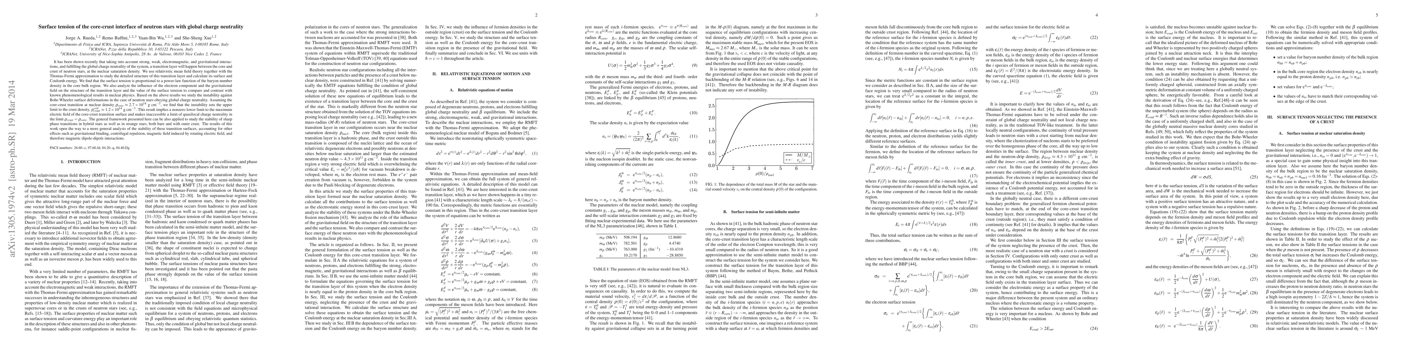 This paper investigates the surface tension of the core-crust interface in neutron stars, considering global charge neutrality and various interactions. It finds that the surface tension follows a power-law density dependence and sets an upper limit on crust density, influencing the maximum electric field at the transition surface.