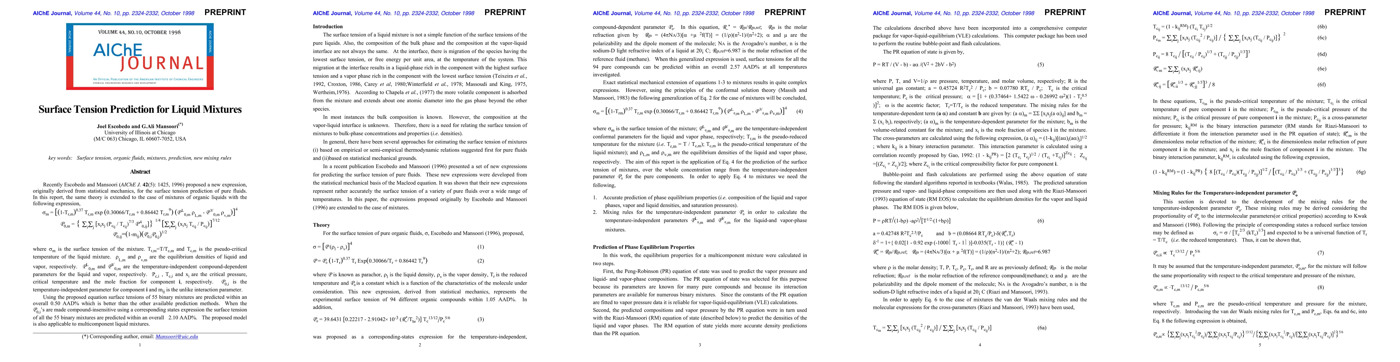 This paper extends Escobedo and Mansoori's statistical mechanics-based surface tension prediction model for pure fluids to mixtures of organic liquids, achieving an overall 0.50% average absolute deviation (AAD) in predicting the surface tensions of 55 binary mixtures, outperforming other methods. The model is also shown to be applicable to multicomponent liquid mixtures.