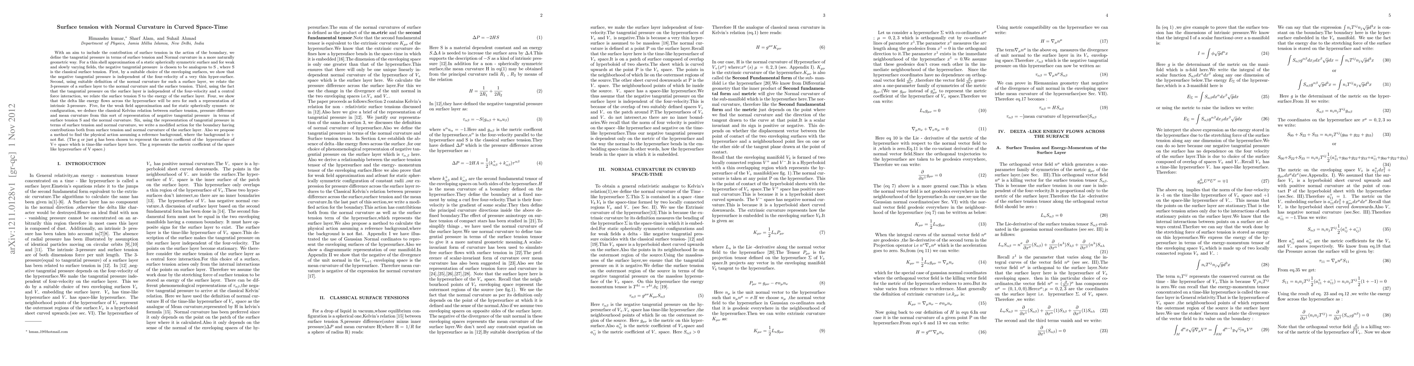 This paper defines tangential pressure in terms of surface tension and normal curvature in curved space-time, showing that negative tangential pressure is independent of the four-velocity. It proposes a modified action for the boundary incorporating surface tension and normal curvature, and deduces the classical Kelvin's relation for static spherically symmetric configurations.