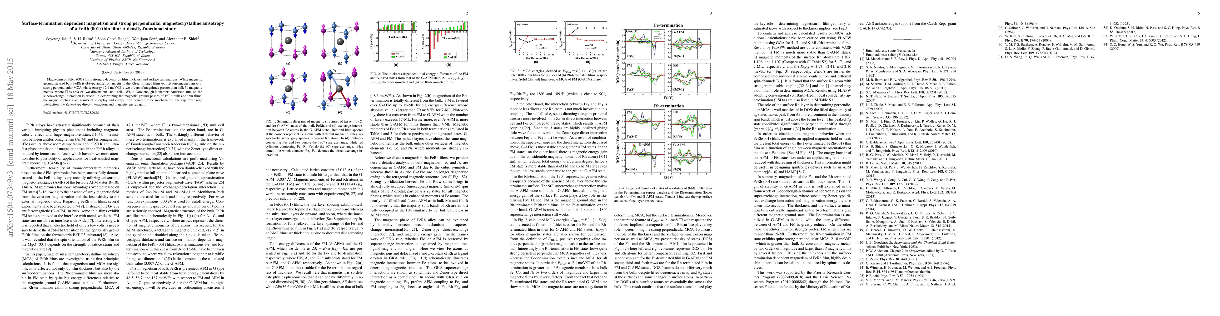 Magnetism of FeRh (001) films strongly depends on film thickness and surface terminations. While magnetic ground state of bulk FeRh is G-type antiferromagnetism, the Rh-terminated films exhibit ferromagnetism with strong perpendicular MCA whose energy +2.1 meV/$\Box$ is two orders of magnitude greater than 3$d$ magnetic metals, where $\Box$ is area of two-dimensional unit cell. While Goodenough-Kanamori-Anderson rule on the superexchange interaction is crucial in determining the magnetic ground phases of FeRh bulk and thin films, the magnetic phases are results of interplay and competition between three mechanisms - the superexchange interaction, the Zener direct-interaction, and magnetic energy gain.