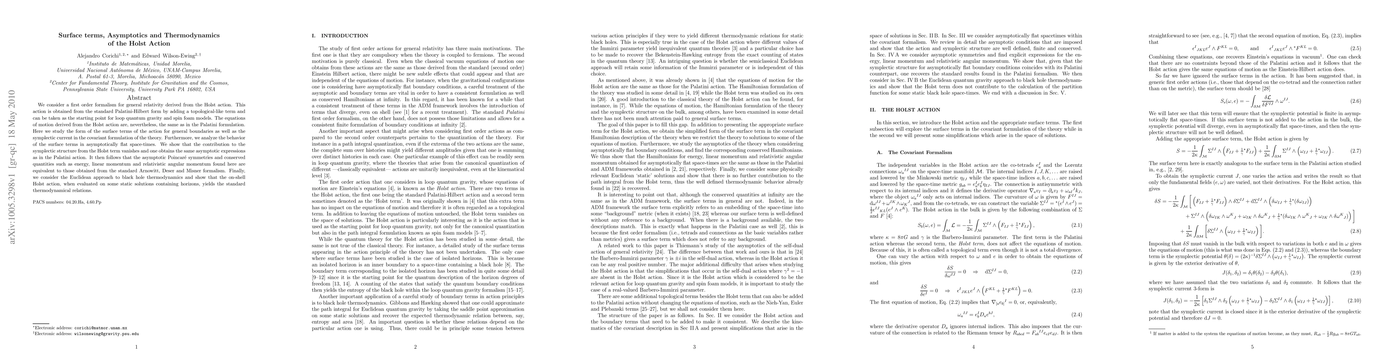 This paper explores the first-order Holst action for general relativity, demonstrating that its equations of motion align with the Palatini formulation. It investigates surface terms and symplectic currents, showing that the asymptotic symmetries and conserved quantities match those from the standard Arnowitt-Deser-Misner formalism, and verifies the thermodynamic relations for black holes in the Euclidean approach.