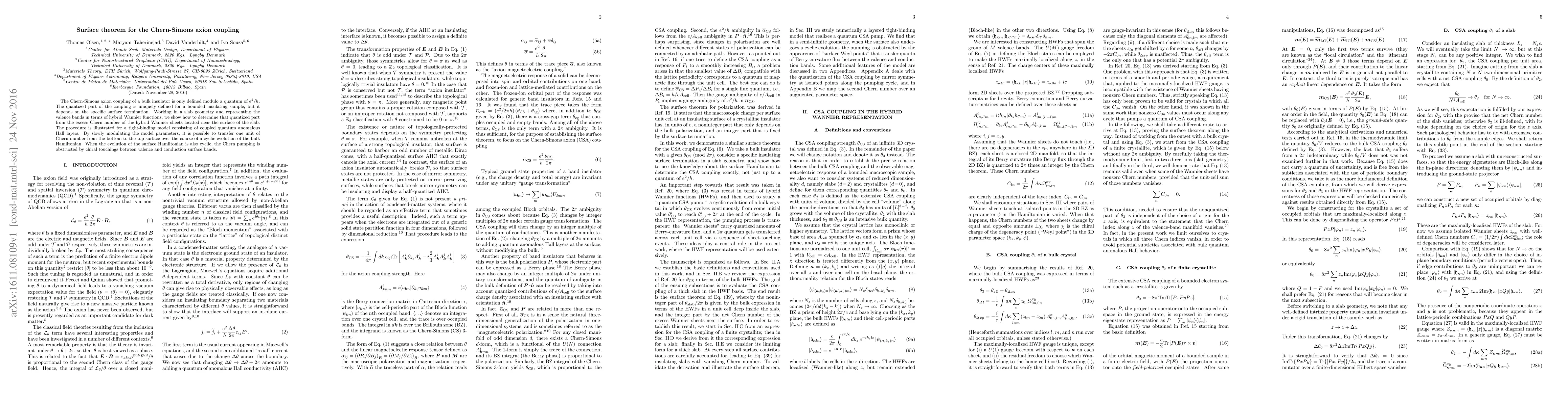 The Chern-Simons axion coupling of a bulk insulator is only defined modulo a quantum of e^2/h. The quantized part of the coupling is uniquely defined for a bounded insulating sample, but it depends on the specific surface termination. Working in a slab geometry and representing the valence bands in terms of hybrid Wannier functions, we show how to determine that quantized part from the excess Chern number of the hybrid Wannier sheets located near the surface of the slab. The procedure is illustrated for a tight-binding model consisting of coupled quantum anomalous Hall layers. By slowly modulating the model parameters, it is possible to transfer one unit of Chern number from the bottom to the top surface over the course of a cyclic evolution of the bulk Hamiltonian. When the evolution of the surface Hamiltonian is also cyclic, the Chern pumping is obstructed by chiral touchings between valence and conduction surface bands.