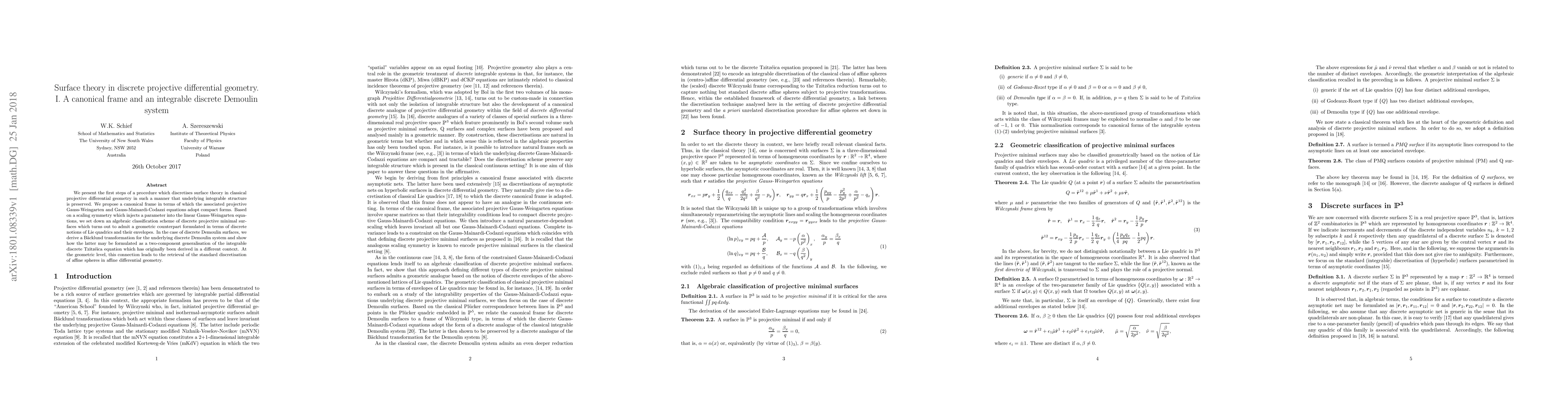 We present the first steps of a procedure which discretises surface theory in classical projective differential geometry in such a manner that underlying integrable structure is preserved. We propose a canonical frame in terms of which the associated projective Gauss-Weingarten and Gauss-Mainardi-Codazzi equations adopt compact forms. Based on a scaling symmetry which injects a parameter into the linear Gauss-Weingarten equations, we set down an algebraic classification scheme of discrete projective minimal surfaces which turns out to admit a geometric counterpart formulated in terms of discrete notions of Lie quadrics and their envelopes. In the case of discrete Demoulin surfaces, we derive a Backlund transformation for the underlying discrete Demoulin system and show how the latter may be formulated as a two-component generalisation of the integrable discrete Tzitzeica equation which has originally been derived in a different context. At the geometric level, this connection leads to the retrieval of the standard discretisation of affine spheres in affine differential geometry.