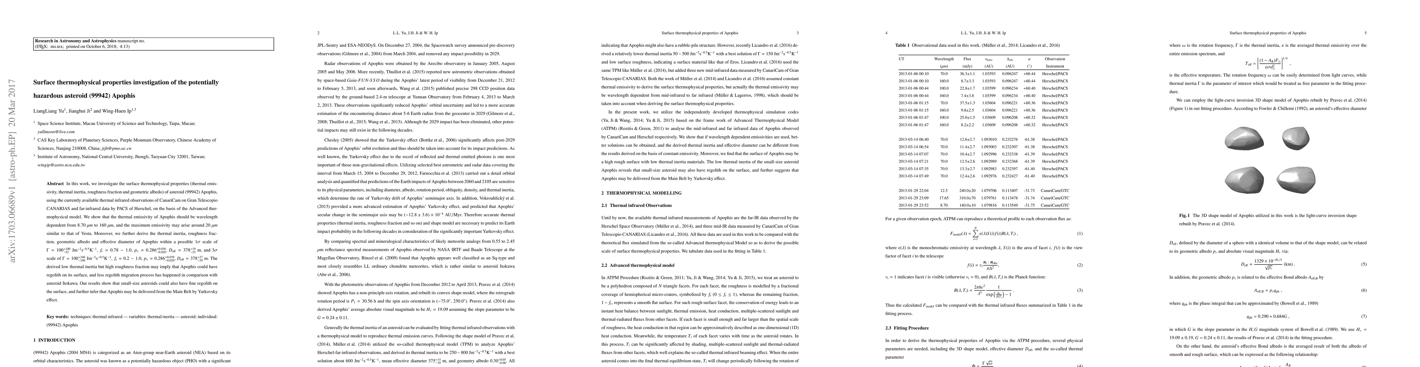This study investigates the surface thermophysical properties of asteroid (99942) Apophis using thermal infrared and far-infrared data, revealing wavelength-dependent thermal emissivity peaking around 20 µm. The derived thermal inertia, roughness fraction, and geometric albedo suggest Apophis has a regolith surface with less migration compared to Itokawa, indicating it may have been delivered from the Main Belt by the Yarkovsky effect.