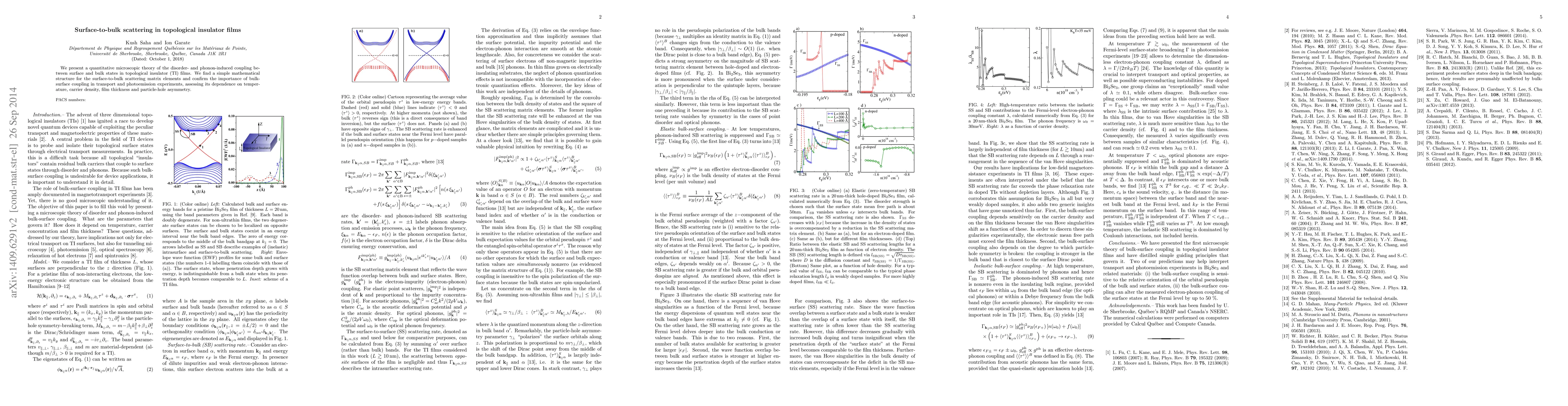 We present a quantitative microscopic theory of the disorder- and phonon-induced coupling between surface and bulk states in topological insulator (TI) films. We find a simple structure for the surface-to-bulk scattering matrix elements and confirm the importance of bulk-surface coupling in transport and photoemission experiments, assessing its dependence on temperature, carrier density, film thickness and particle-hole asymmetry.