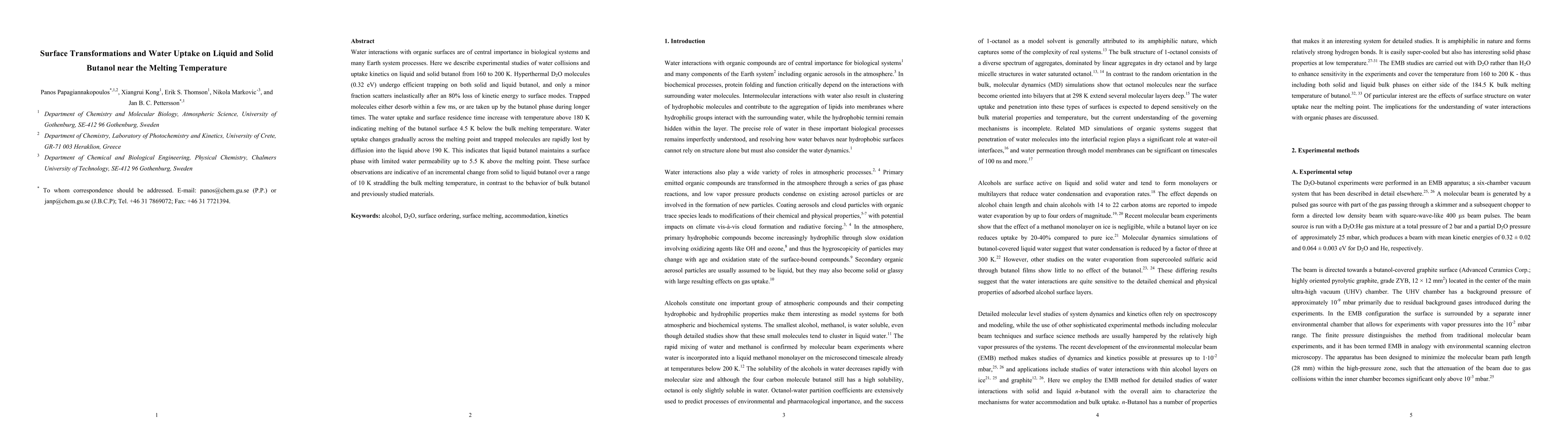 Water interactions with organic surfaces are of central importance in biological systems and many Earth system processes. Here we describe experimental studies of water collisions and uptake kinetics on liquid and solid butanol from 160 to 200 K. Hyperthermal D2O molecules (0.32 eV) undergo efficient trapping on both solid and liquid butanol, and only a minor fraction scatters inelastically after an 80% loss of kinetic energy to surface modes. Trapped molecules either desorb within a few ms, or are taken up by the butanol phase during longer times. The water uptake and surface residence time increase with temperature above 180 K indicating melting of the butanol surface 4.5 K below the bulk melting temperature. Water uptake changes gradually across the melting point and trapped molecules are rapidly lost by diffusion into the liquid above 190 K. This indicates that liquid butanol maintains a surface phase with limited water permeability up to 5.5 K above the melting point. These surface observations are indicative of an incremental change from solid to liquid butanol over a range of 10 K straddling the bulk melting temperature, in contrast to the behavior of bulk butanol and previously studied materials.
