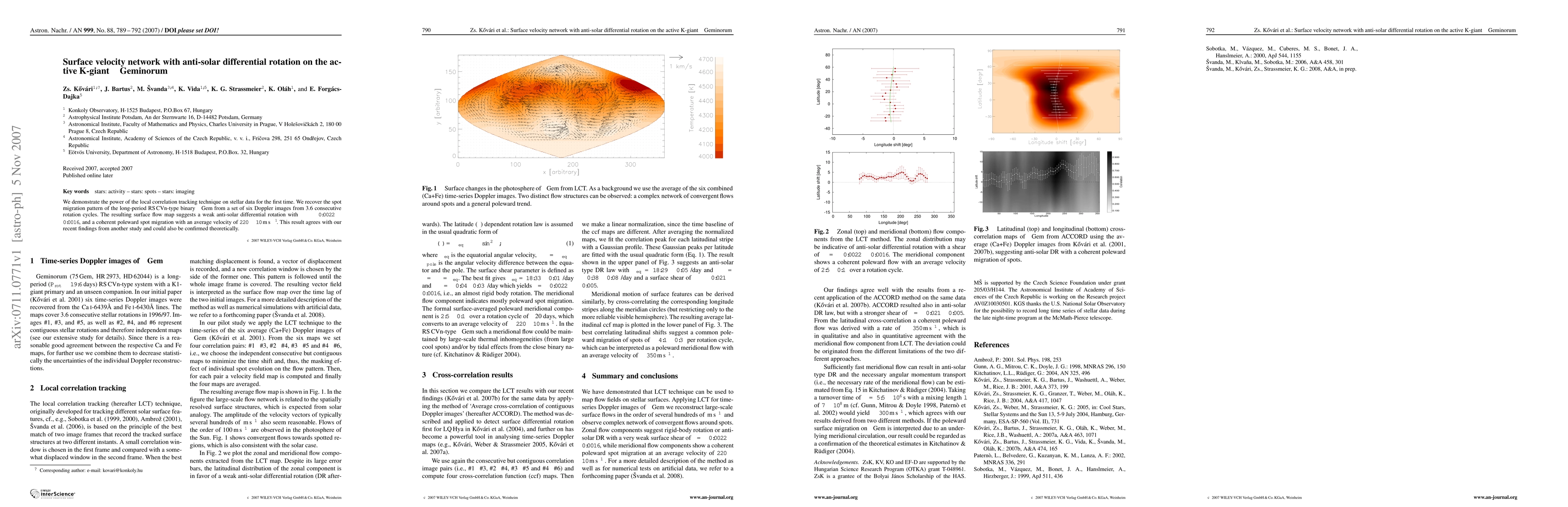 This paper uses local correlation tracking to analyze the surface velocity of the K-giant star $\sigma$ Geminorum, revealing a weak anti-solar differential rotation and a coherent poleward spot migration pattern. The findings support previous results and align with theoretical predictions.