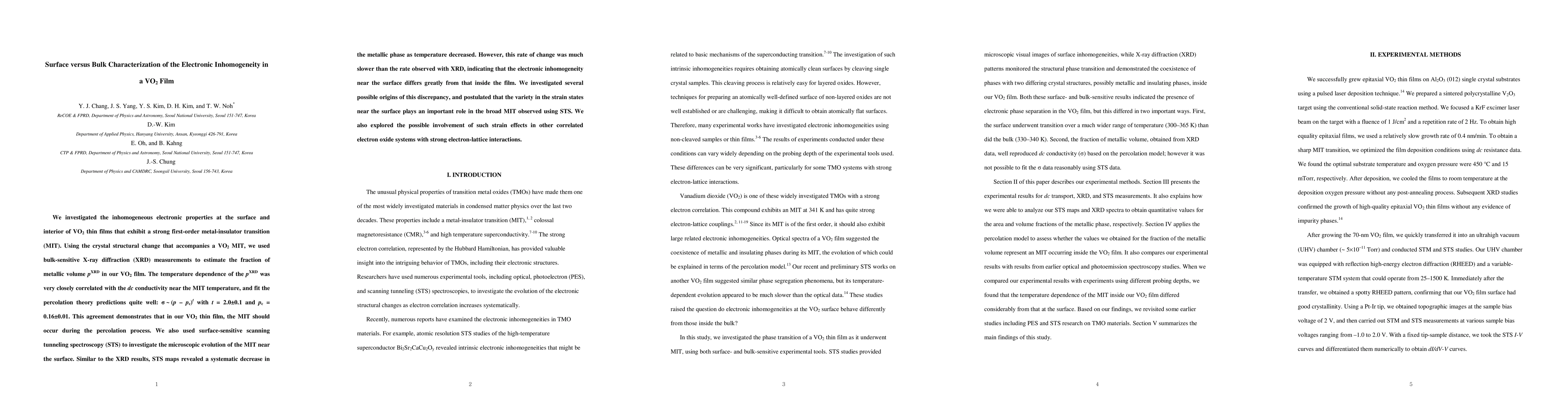 We investigated the inhomogeneous electronic properties at the surface and interior of VO_{2} thin films that exhibit a strong first-order metal-insulator transition (MIT). Using the crystal structural change that accompanies a VO_{2} MIT, we used bulk-sensitive X-ray diffraction (XRD) measurements to estimate the fraction of metallic volume p^{XRD} in our VO_{2} film. The temperature dependence of the p$^{XRD}$ was very closely correlated with the dc conductivity near the MIT temperature, and fit the percolation theory predictions quite well: $\sigma$ $\sim$ (p - p_{c})^{t} with t = 2.0$\pm$0.1 and p_{c} = 0.16$\pm$0.01. This agreement demonstrates that in our VO$_{2}$ thin film, the MIT should occur during the percolation process. We also used surface-sensitive scanning tunneling spectroscopy (STS) to investigate the microscopic evolution of the MIT near the surface. Similar to the XRD results, STS maps revealed a systematic decrease in the metallic phase as temperature decreased. However, this rate of change was much slower than the rate observed with XRD, indicating that the electronic inhomogeneity near the surface differs greatly from that inside the film. We investigated several possible origins of this discrepancy, and postulated that the variety in the strain states near the surface plays an important role in the broad MIT observed using STS. We also explored the possible involvement of such strain effects in other correlated electron oxide systems with strong electron-lattice interactions.