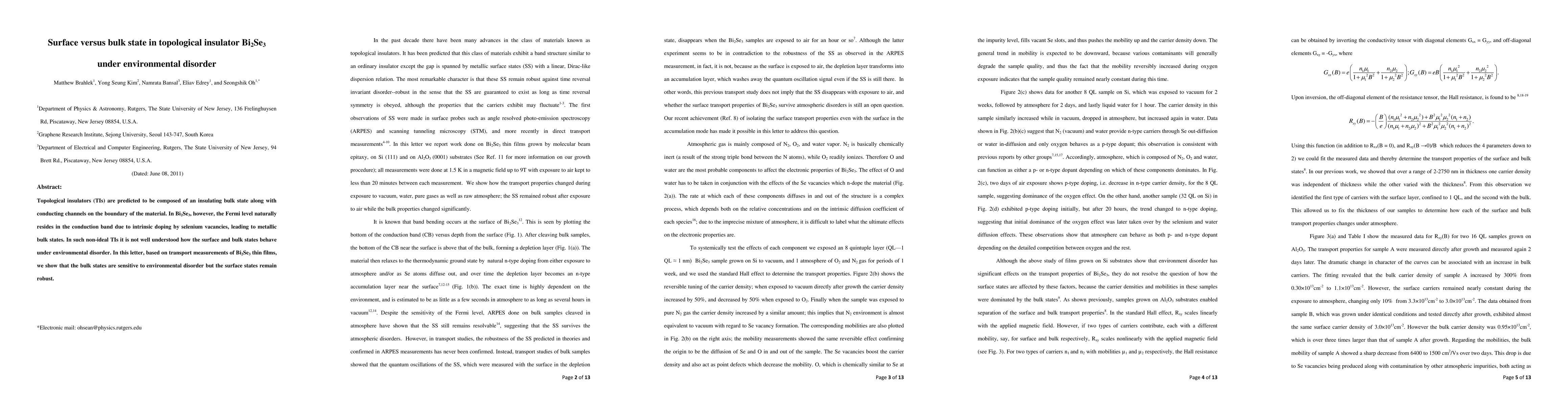 This paper investigates how environmental disorder affects the surface versus bulk states in the topological insulator Bi2Se3. Transport measurements reveal that while bulk states become sensitive to disorder, the surface states remain robust, highlighting the resilience of topological surface states.