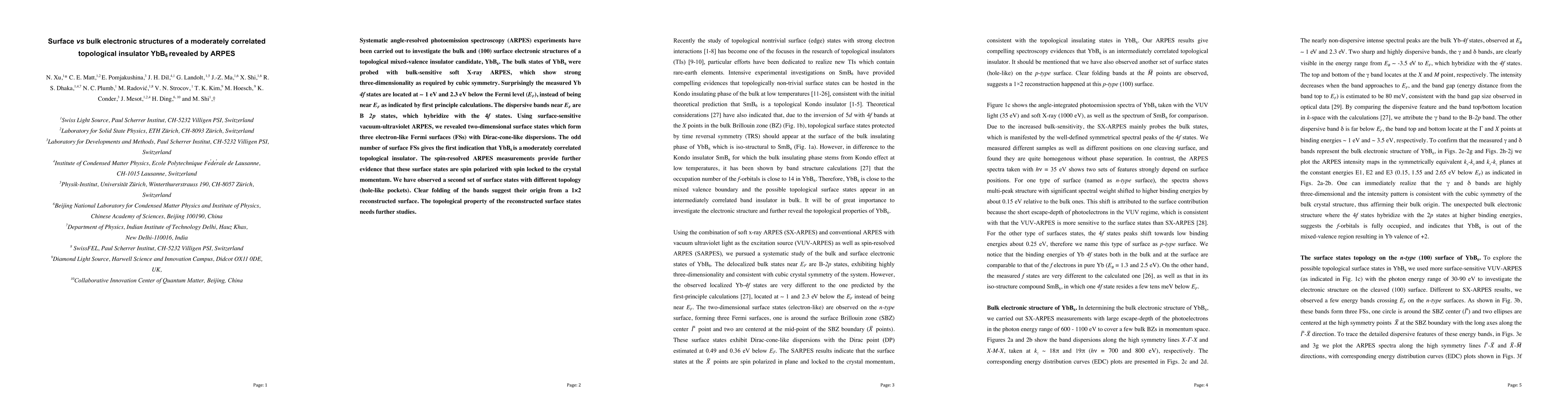 This paper uses ARPES to investigate the electronic structures of YbB6, revealing that its bulk states exhibit strong three-dimensionality and unexpected Yb 4f states. The surface states show two-dimensional electron-like Fermi surfaces indicating YbB6's potential as a moderately correlated topological insulator, with spin-polarized surface states and a second set of hole-like surface states suggesting a 1X2 reconstructed surface.