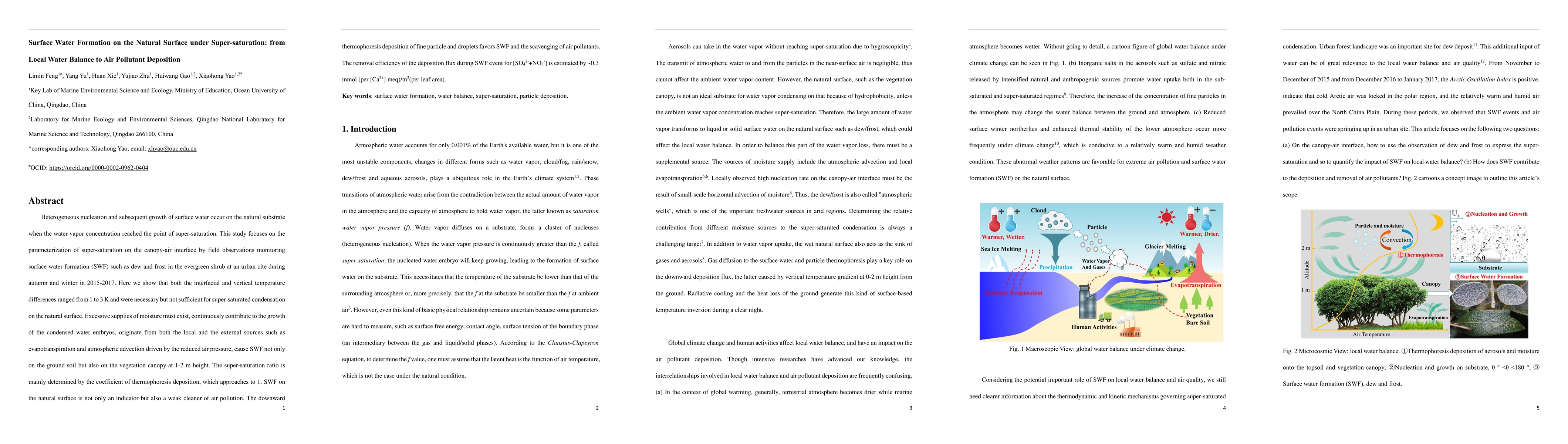 Heterogeneous nucleation and subsequent growth of surface water occur on the natural substrate when the water vapor concentration reached the point of super-saturation. This study focuses on the parameterization of super-saturation on the canopy-air interface by field observations monitoring surface water formation (SWF) such as dew and frost in the evergreen shrub at an urban cite during autumn and winter in 2015-2017. Here we show that both the interfacial and vertical temperature differences ranged from 1 to 3 K and were necessary but not sufficient for super-saturated condensation on the natural surface. Excessive supplies of moisture must exist, continuously contribute to the growth of the condensed water embryos, originate from both the local and the external sources such as evapotranspiration and atmospheric advection driven by the reduced air pressure, cause SWF not only on the ground soil but also on the vegetation canopy at 1-2 m height. The super-saturation ratio is mainly determined by the coefficient of thermophoresis deposition, which approaches to 1. SWF on the natural surface is not only an indicator but also a weak cleaner of air pollution. The downward thermophoresis deposition of fine particle and droplets favors SWF and the scavenging of air pollutants. The removal efficiency of the deposition flux during SWF event for [SO42-+NO3-] is estimated by ~0.3 mmol (per [Ca2+] meq)/m2(per leaf area).