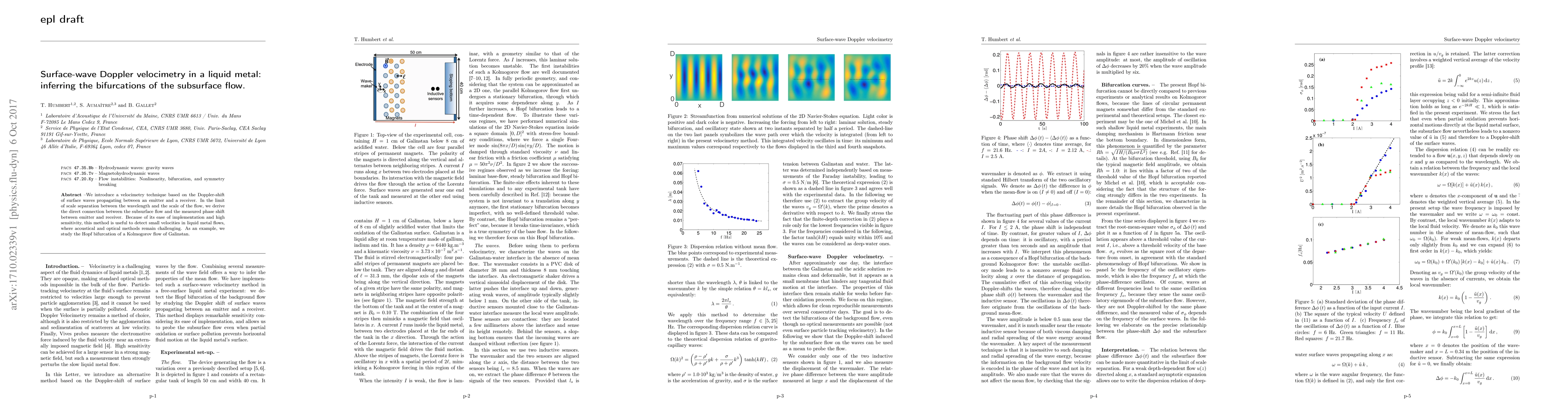 This paper presents a novel Doppler velocimetry technique using surface waves to measure subsurface flow in liquid metals, revealing its application in detecting small velocities. The method successfully identifies the Hopf bifurcation in a Kolmogorov flow of Galinstan, demonstrating its effectiveness in challenging environments where traditional methods fail.