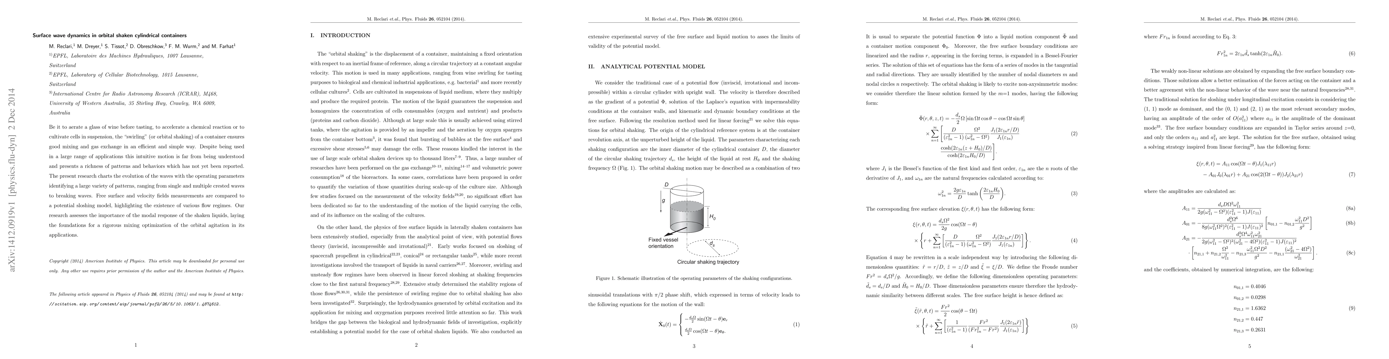 Be it to aerate a glass of wine before tasting, to accelerate a chemical reaction or to cultivate cells in suspension, the "swirling" (or orbital shaking) of a container ensures good mixing and gas exchange in an efficient and simple way. Despite being used in a large range of applications this intuitive motion is far from being understood and presents a richness of patterns and behaviors which has not yet been reported. The present research charts the evolution of the waves with the operating parameters identifying a large variety of patterns, ranging from single and multiple crested waves to breaking waves. Free surface and velocity fields measurements are compared to a potential sloshing model, highlighting the existence of various flow regimes. Our research assesses the importance of the modal response of the shaken liquids, laying the foundations for a rigorous mixing optimization of the orbital agitation in its applications. Copyright (2014) American Institute of Physics. This article may be downloaded for personal use only. Any other use requires prior permission of the author and the American Institute of Physics. The following article appeared in Physics of Fluids 26, 052104 (2014) and may be found at http://dx.doi.org/10.1063/1.4874612