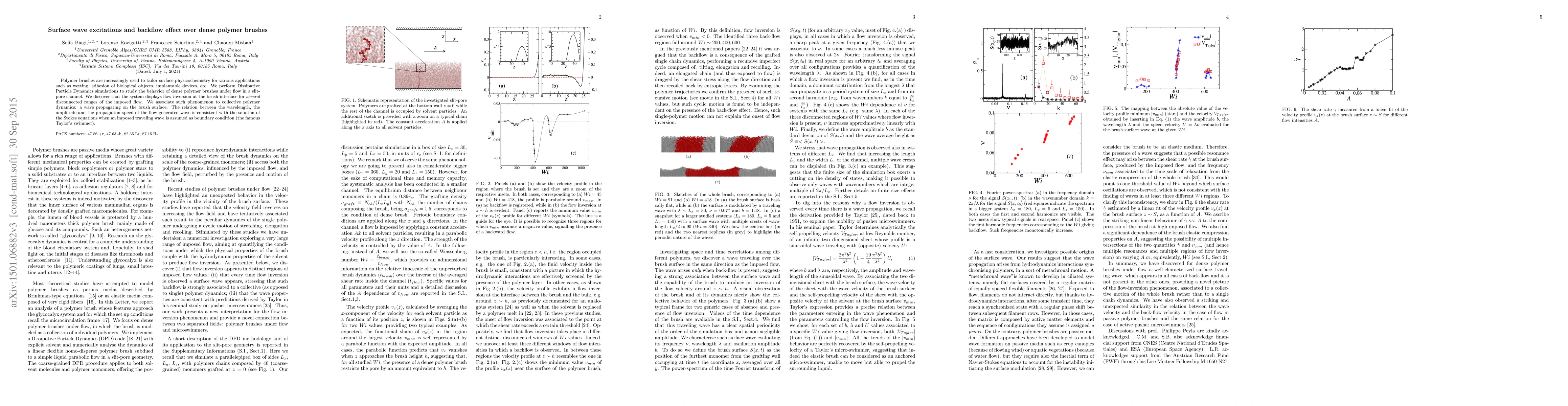 This paper uses Dissipative Particle Dynamics simulations to study dense polymer brushes under flow, revealing flow inversion and wave-like surface excitations. The observed wave dynamics correlate with the Stokes equations, indicating a collective polymer response termed the backflow effect.