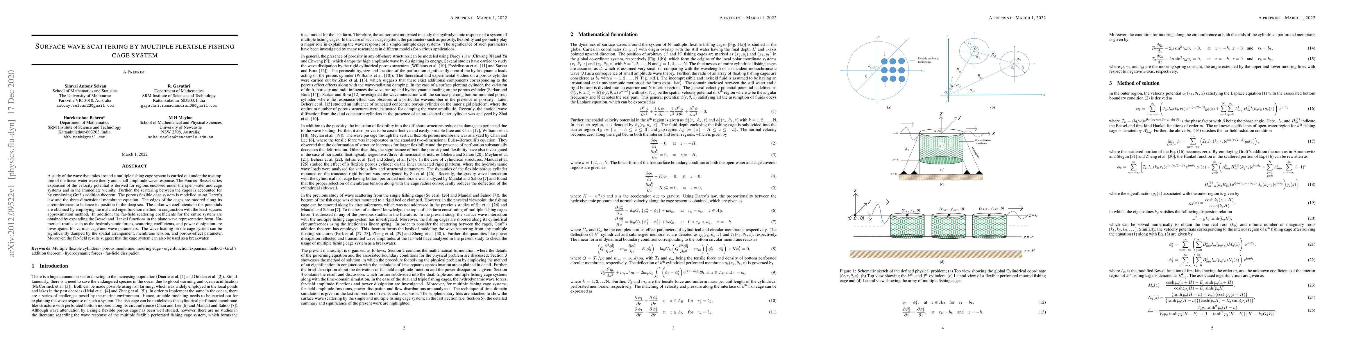 This study investigates wave scattering dynamics around a flexible fishing cage system using linear water wave theory, modeling the porous flexible cages with Darcy's law and membrane equations. Numerical results show significant wave damping and potential breakwater functionality based on cage arrangement and membrane tension.