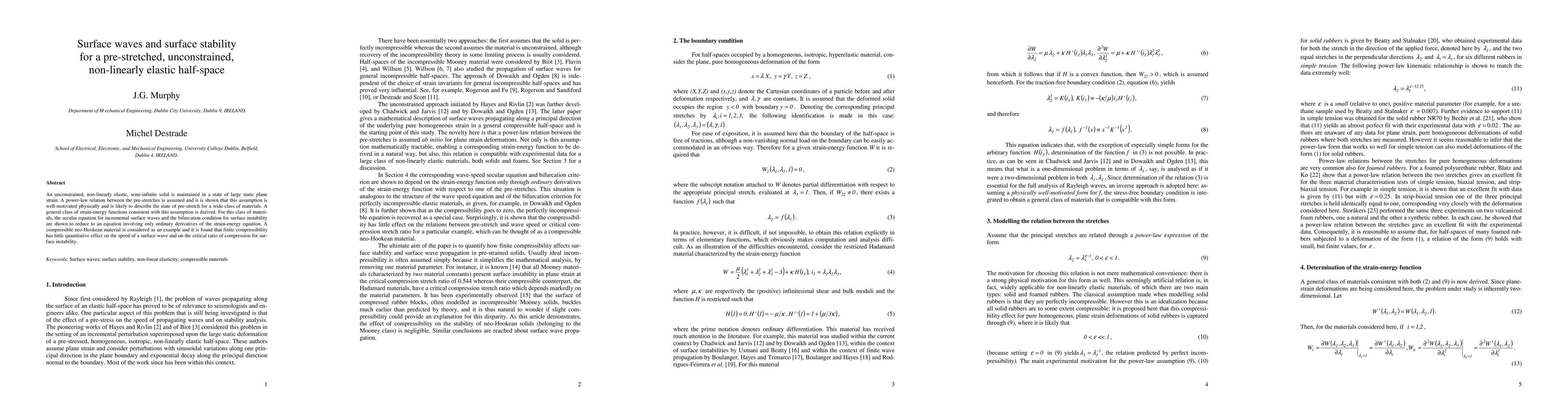 An unconstrained, non-linearly elastic, semi-infinite solid is maintained in a state of large static plane strain. A power-law relation between the pre-stretches is assumed and it is shown that this assumption is well-motivated physically and is likely to describe the state of pre-stretch for a wide class of materials. A general class of strain-energy functions consistent with this assumption is derived. For this class of materials, the secular equation for incremental surface waves and the bifurcation condition for surface instability are shown to reduce to an equation involving only ordinary derivatives of the strain-energy equation. A compressible neo-Hookean material is considered as an example and it is found that finite compressibility has little quantitative effect on the speed of a surface wave and on the critical ratio of compression for surface instability.