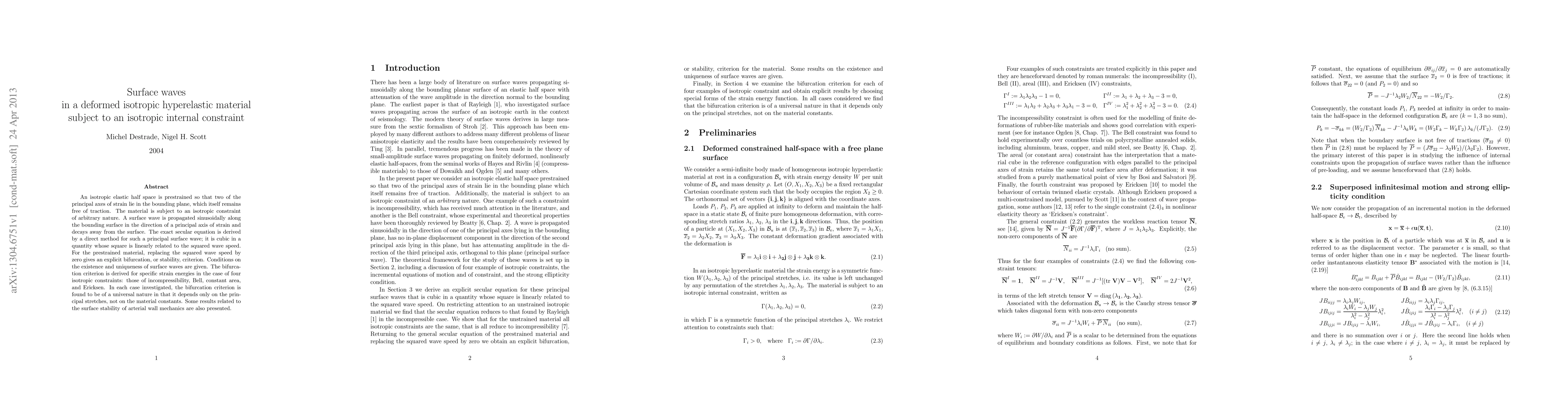 This paper investigates surface waves in a prestrained isotropic elastic material under an isotropic internal constraint, deriving a cubic secular equation for principal surface waves. It establishes a universal bifurcation criterion dependent on principal stretches rather than material constants, applicable to various strain energy models and relevant to arterial wall mechanics.
