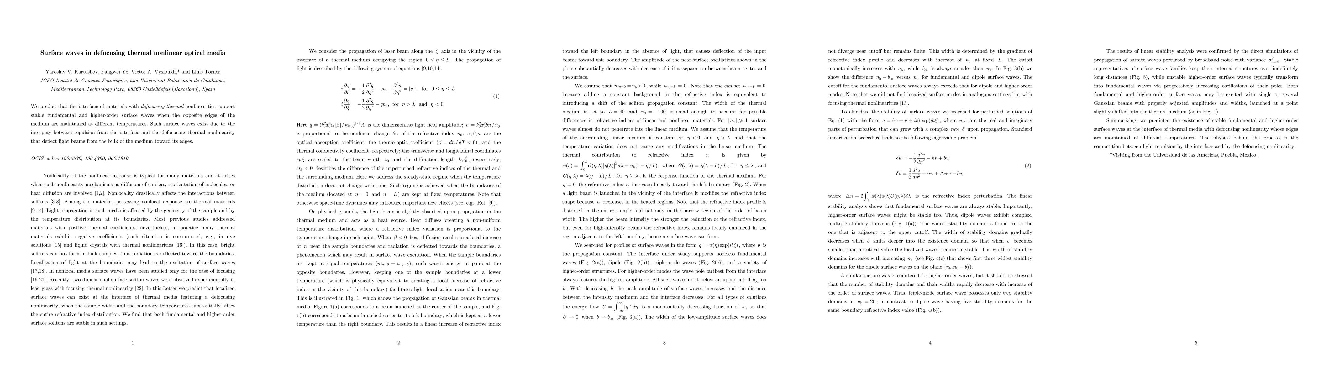 We predict that the interface of materials with defocusing thermal nonlinearities support stable fundamental and higher-order surface waves when the opposite edges of the medium are maintained at different temperatures. Such surface waves exist due to the interplay between repulsion from the interface and the defocusing thermal nonlinearity that deflect light beams from the bulk of the medium toward its edges.