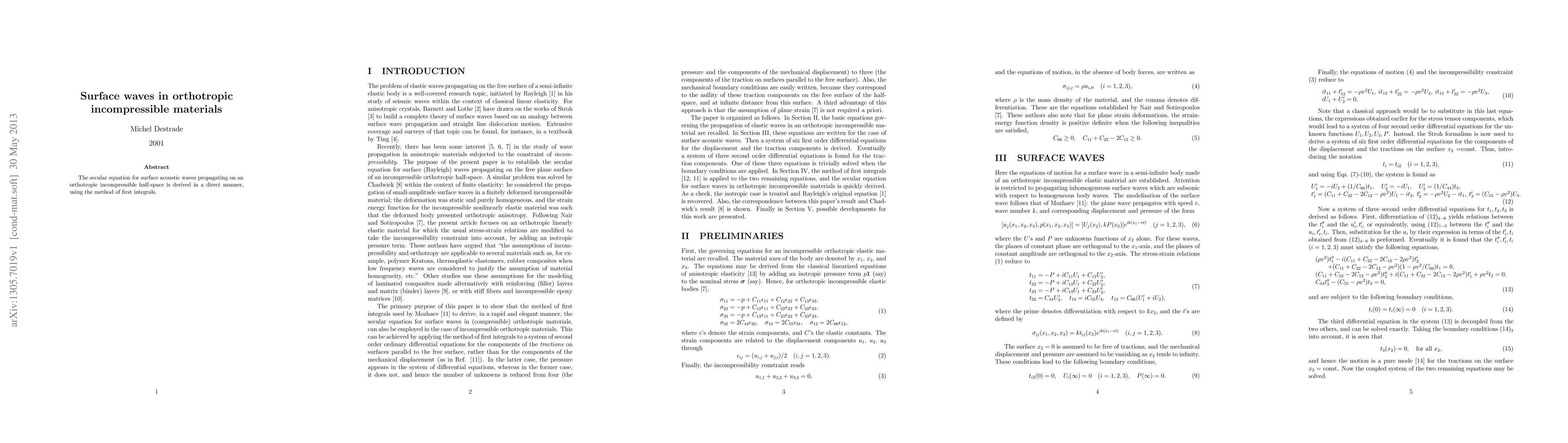 The secular equation for surface acoustic waves propagating on an orthotropic incompressible half-space is derived in a direct manner, using the method of first integrals.