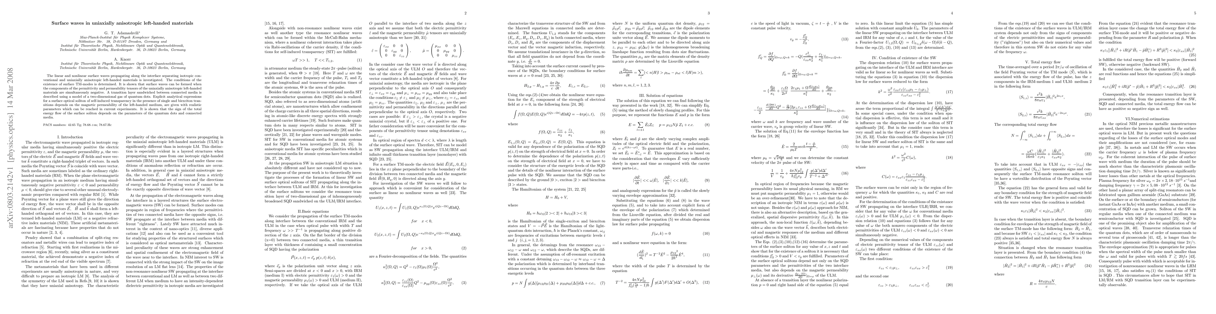 This research investigates linear and nonlinear surface waves in uniaxially anisotropic left-handed materials, identifying conditions for the existence of TM-mode surface waves, and provides analytical expressions for surface optical solitons dependent on magnetic permeability, revealing the impact of quantum dot parameters on energy flow.