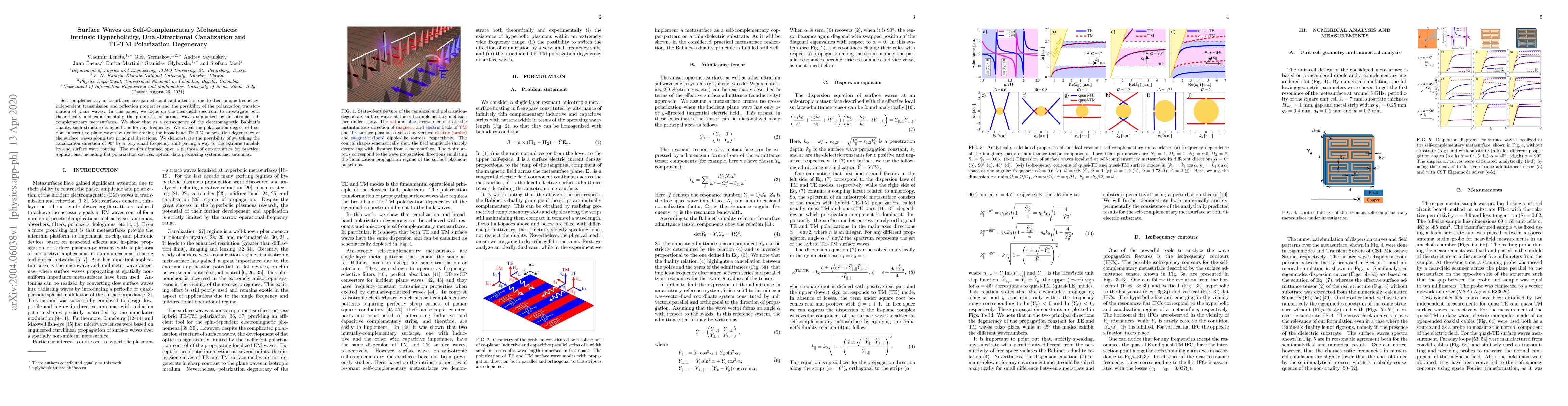This paper investigates surface waves on anisotropic self-complementary metasurfaces, revealing intrinsic hyperbolicity and dual-directional canalization. The study demonstrates TE-TM polarization degeneracy and the potential for tunable surface wave routing, suggesting applications in optical data processing and antennas.