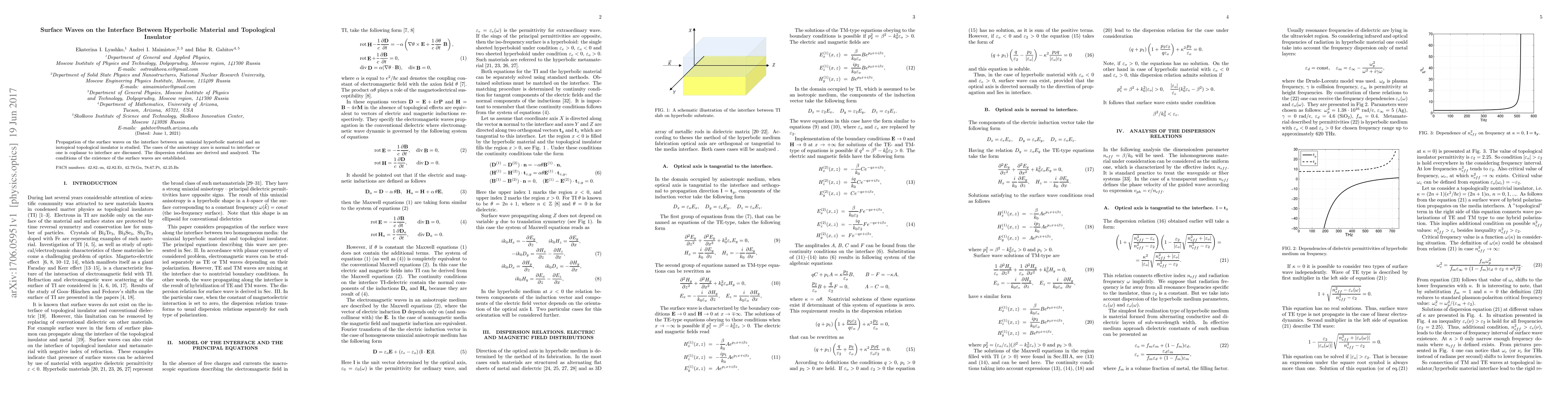 Propagation of the surface waves on the interface between an uniaxial hyperbolic material and an isotopical topological insulator is studied. The cases of the anisotropy axes is normal to interface or one is coplanar to interface are discussed. The dispersion relations are derived and analyzed. The conditions of the existence of the surface waves are established.