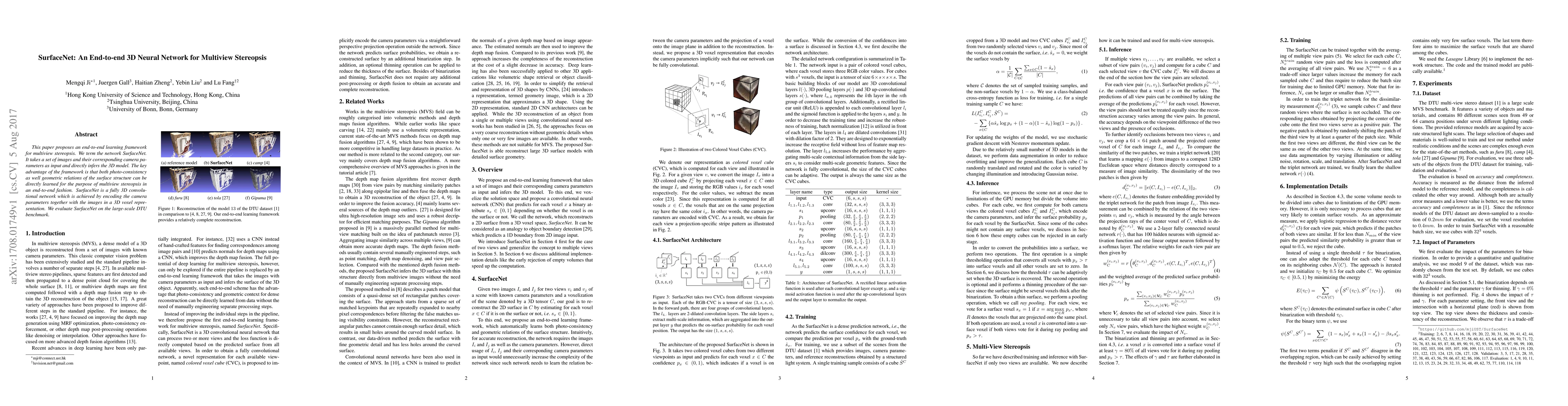 SurfaceNet is an end-to-end 3D neural network for multiview stereopsis that directly infers 3D models from images and camera parameters, leveraging 3D convolutional processing. It learns both photo-consistency and geometric relations in an end-to-end fashion, evaluated on the DTU benchmark.