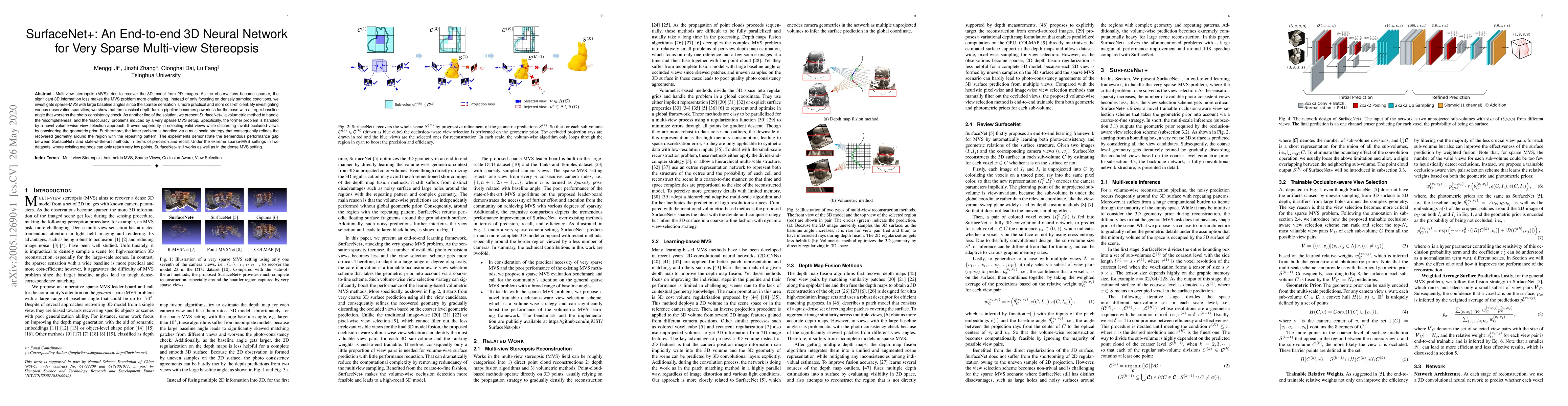 SurfaceNet+ is a novel 3D neural network designed for very sparse multi-view stereopsis, addressing the challenges of incomplete and inaccurate 3D model recovery from sparse observations. It employs a volume-wise view selection and a multi-scale refinement strategy to outperform existing methods in precision and recall.