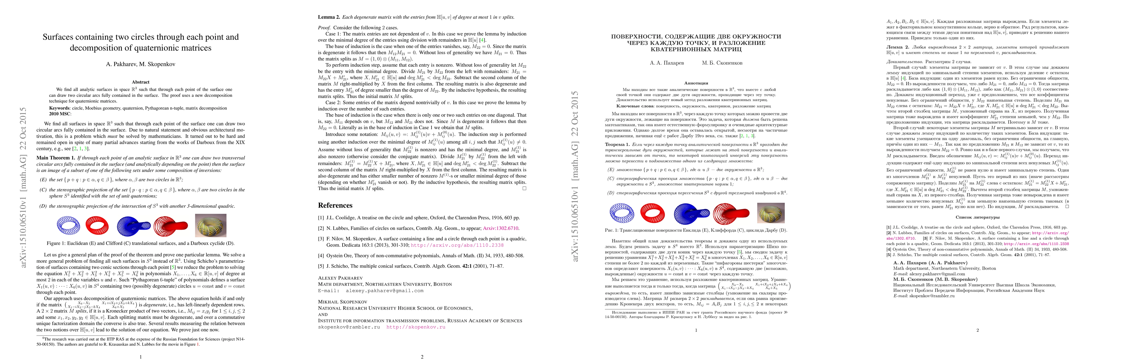 Summary: This paper identifies all analytic surfaces in R^3 where two circular arcs pass through each point, employing a novel decomposition method for quaternionic matrices to achieve the proof.